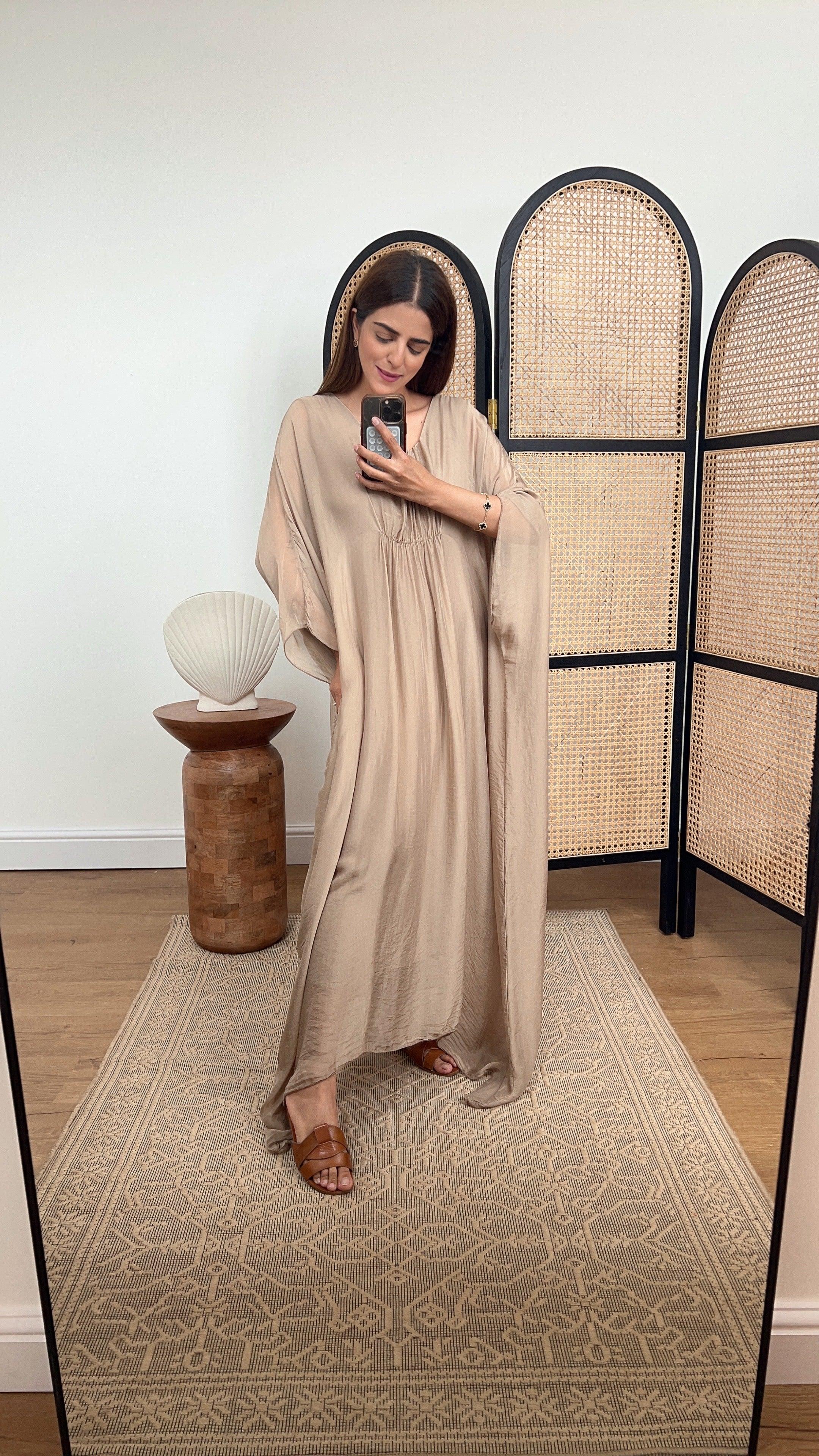 Beautiful flowy dress with a v neck and flare sleeves and knee length lining.