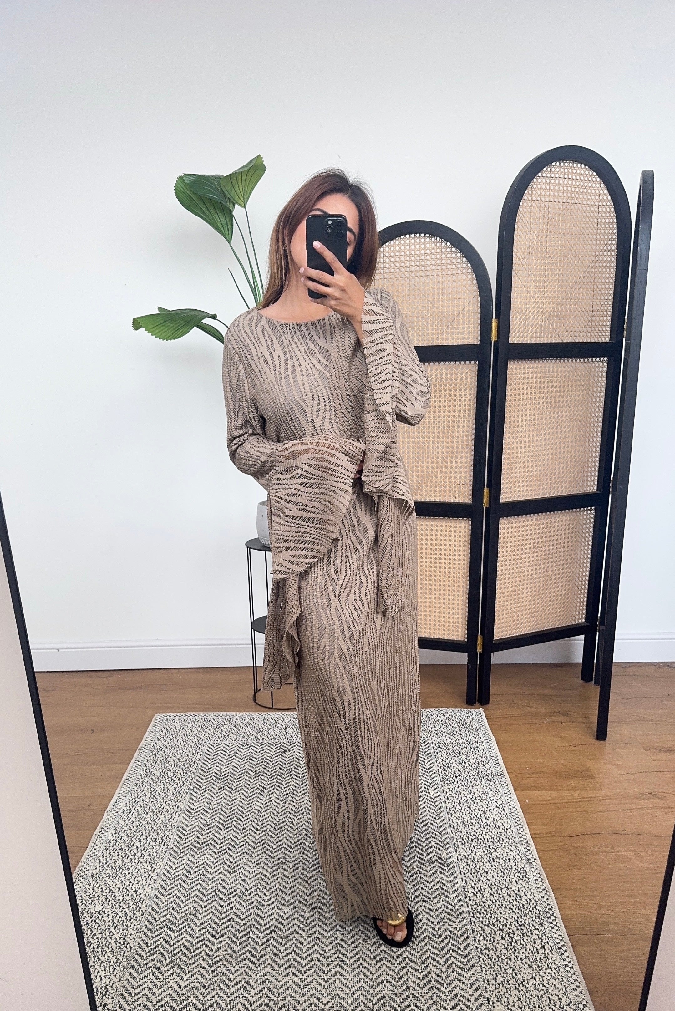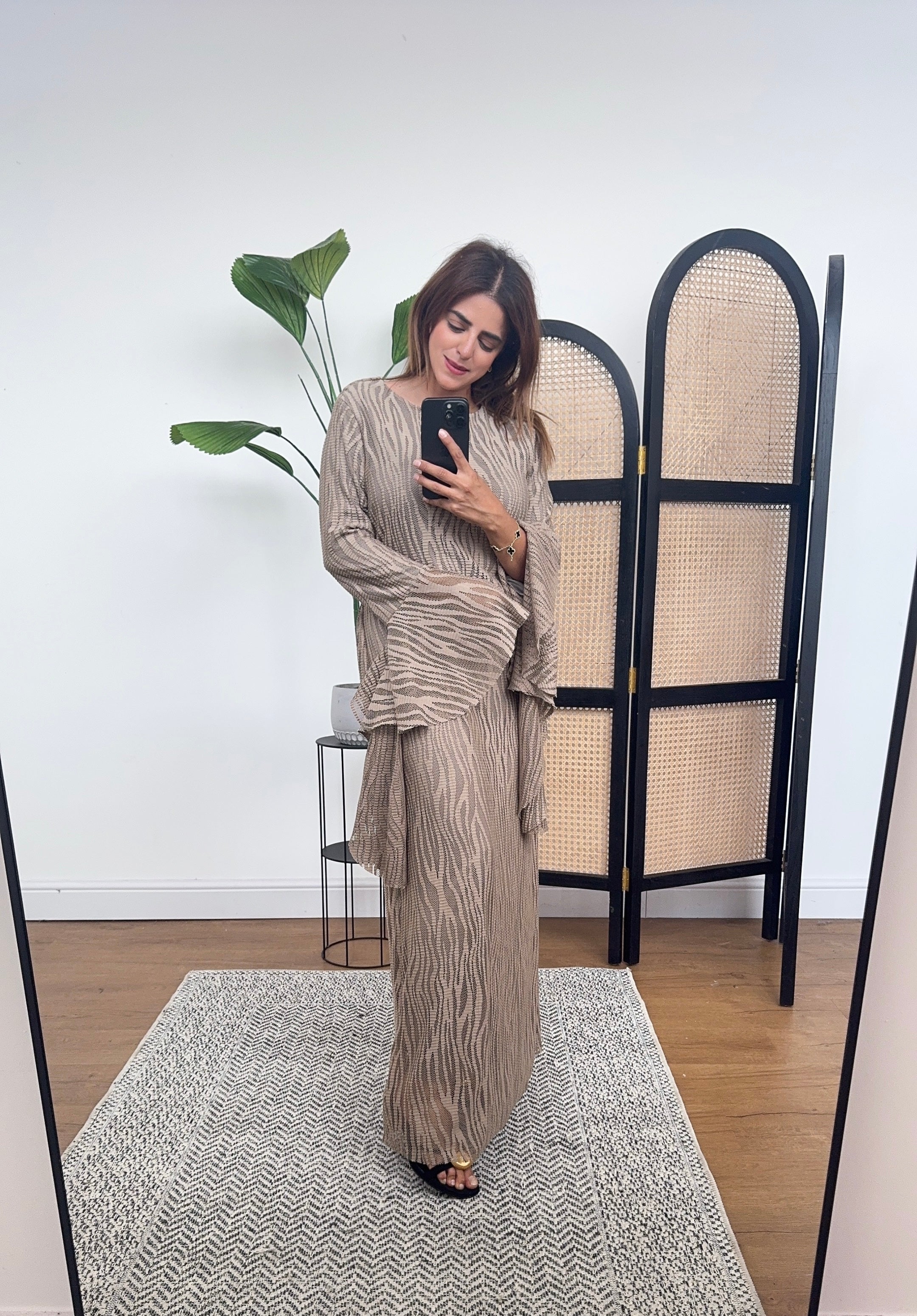 A beautiful, fully lined dress featuring full frill sleeves and a flattering belt for a fitted silhouette.