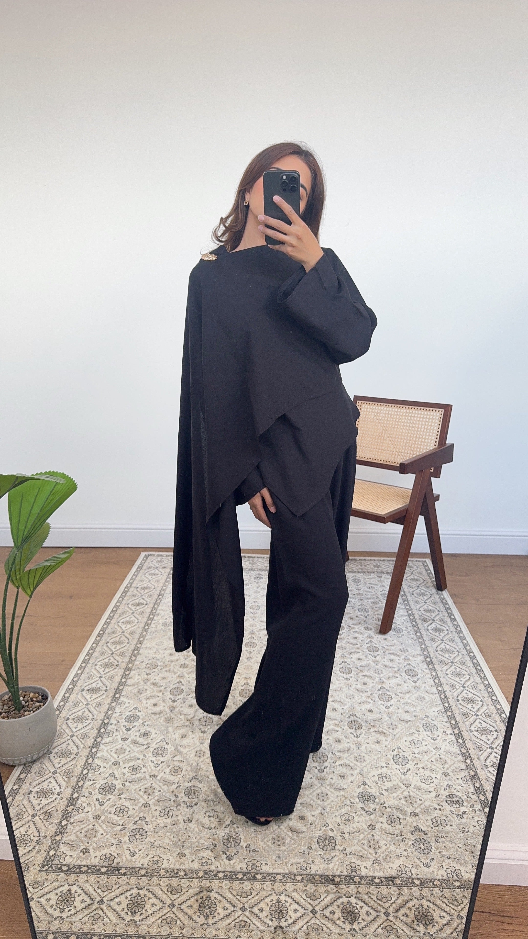 This chic asymmetric top features a draping scarf and a gold brooch detail for a touch of elegance. The longer back provides extra coverage, while the lightweight summer fabric keeps you cool. Paired with elasticated waist trousers for a comfortable, flattering fit, this set blends style and comfort effortlessly—perfect for any warm-weather occasion.