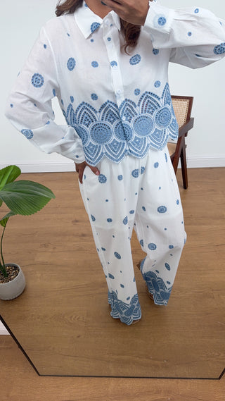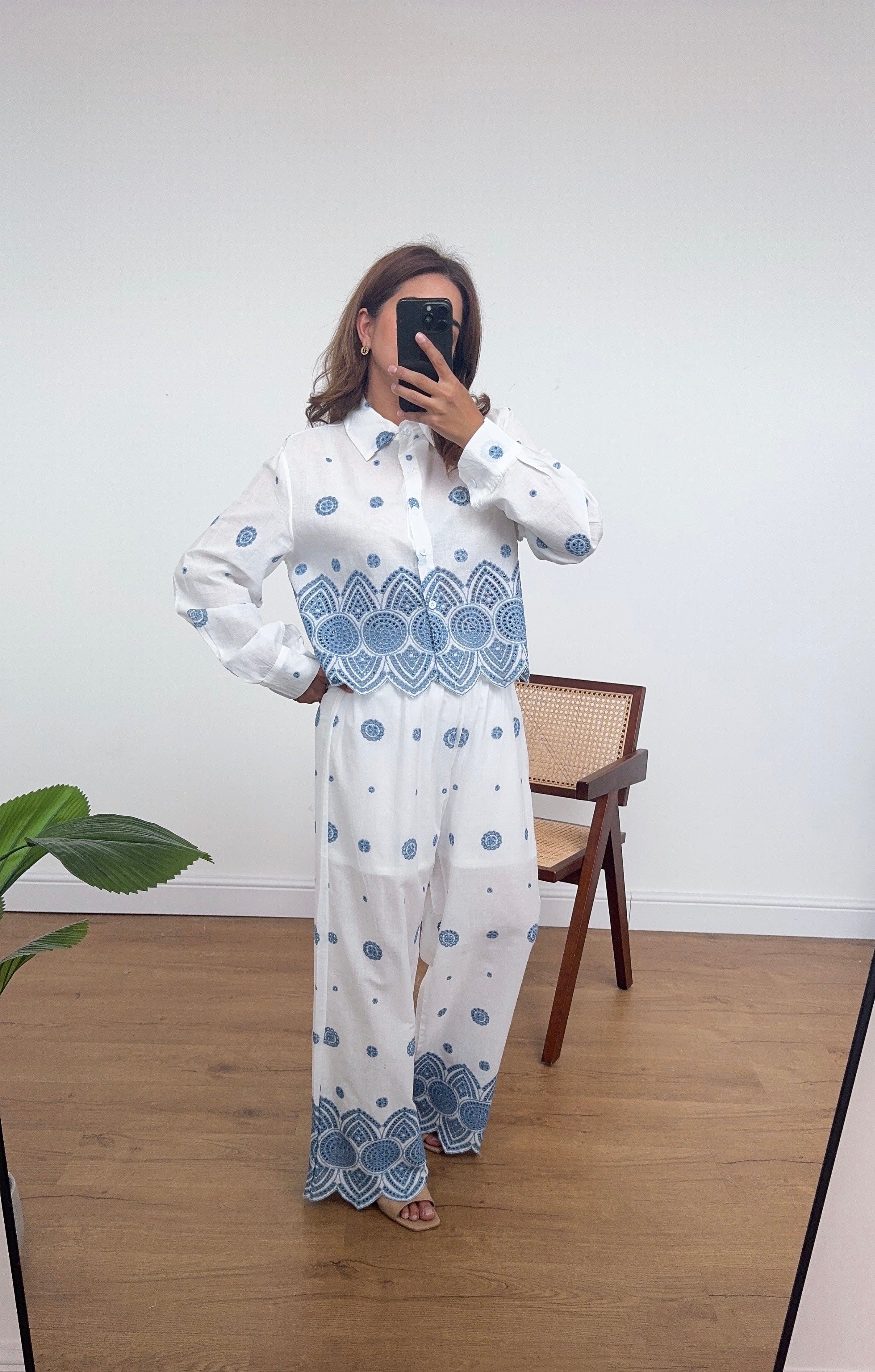 A stunning crochet co-ord set featuring a breezy, slightly see-through button-up shirt and matching wide-leg trousers. Lightweight and elegant, perfect for summer—best layered with a white inner set for modesty and contrast.