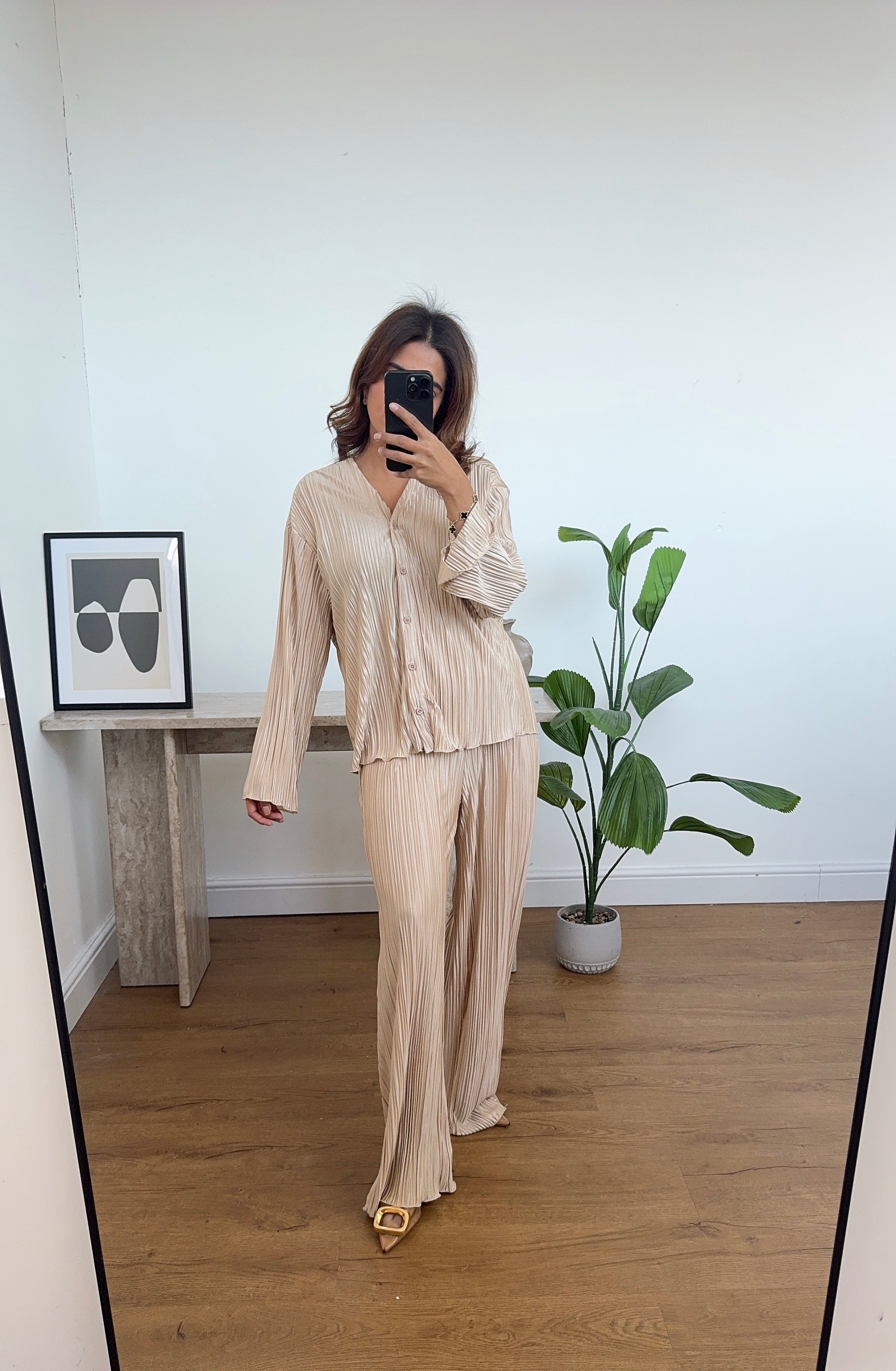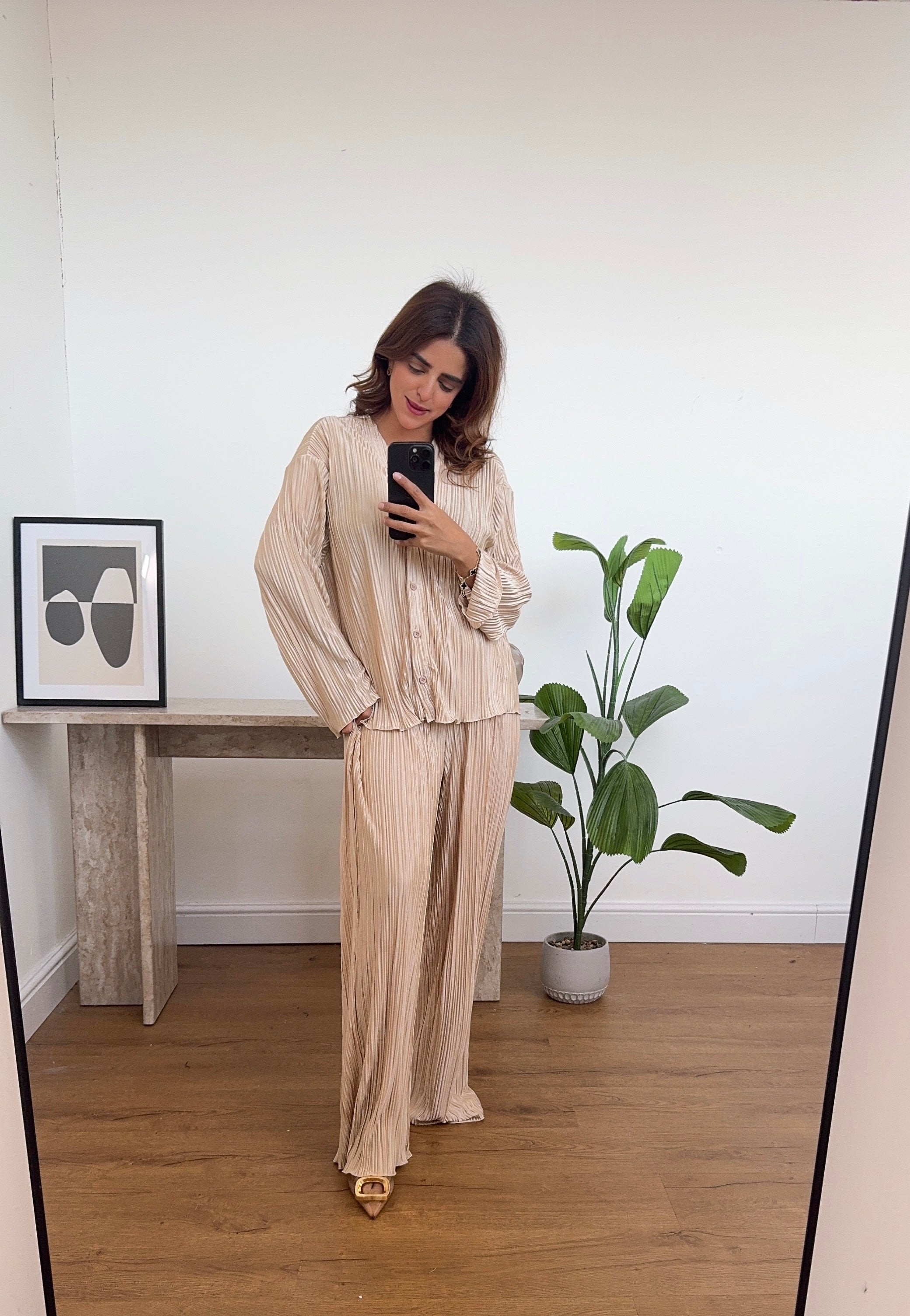 The ultimate throw on co ord that will make you look put together instantly! Dress it with heels or more casual- perfect for breastfeeding mamas as it has a button down shirt.
