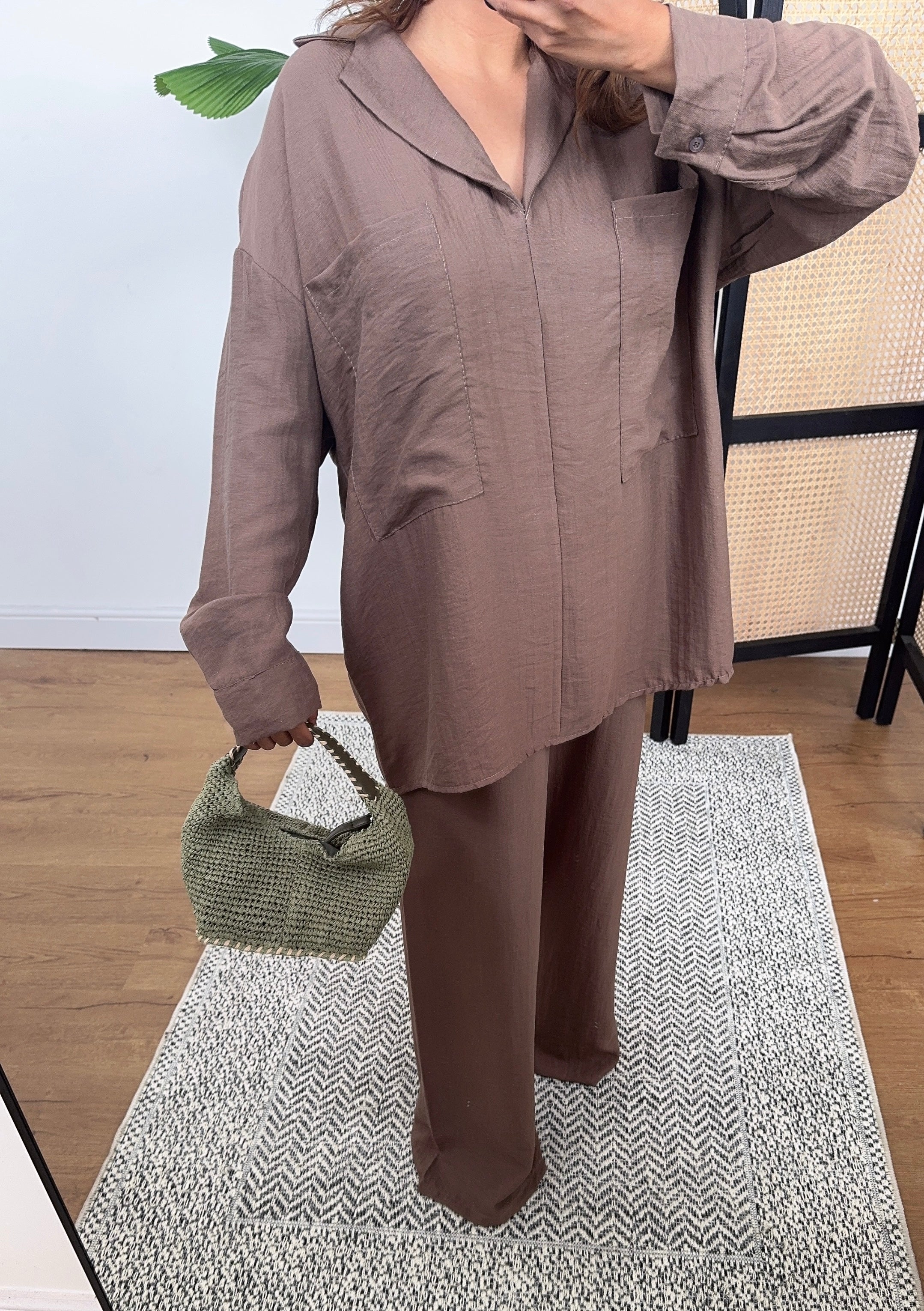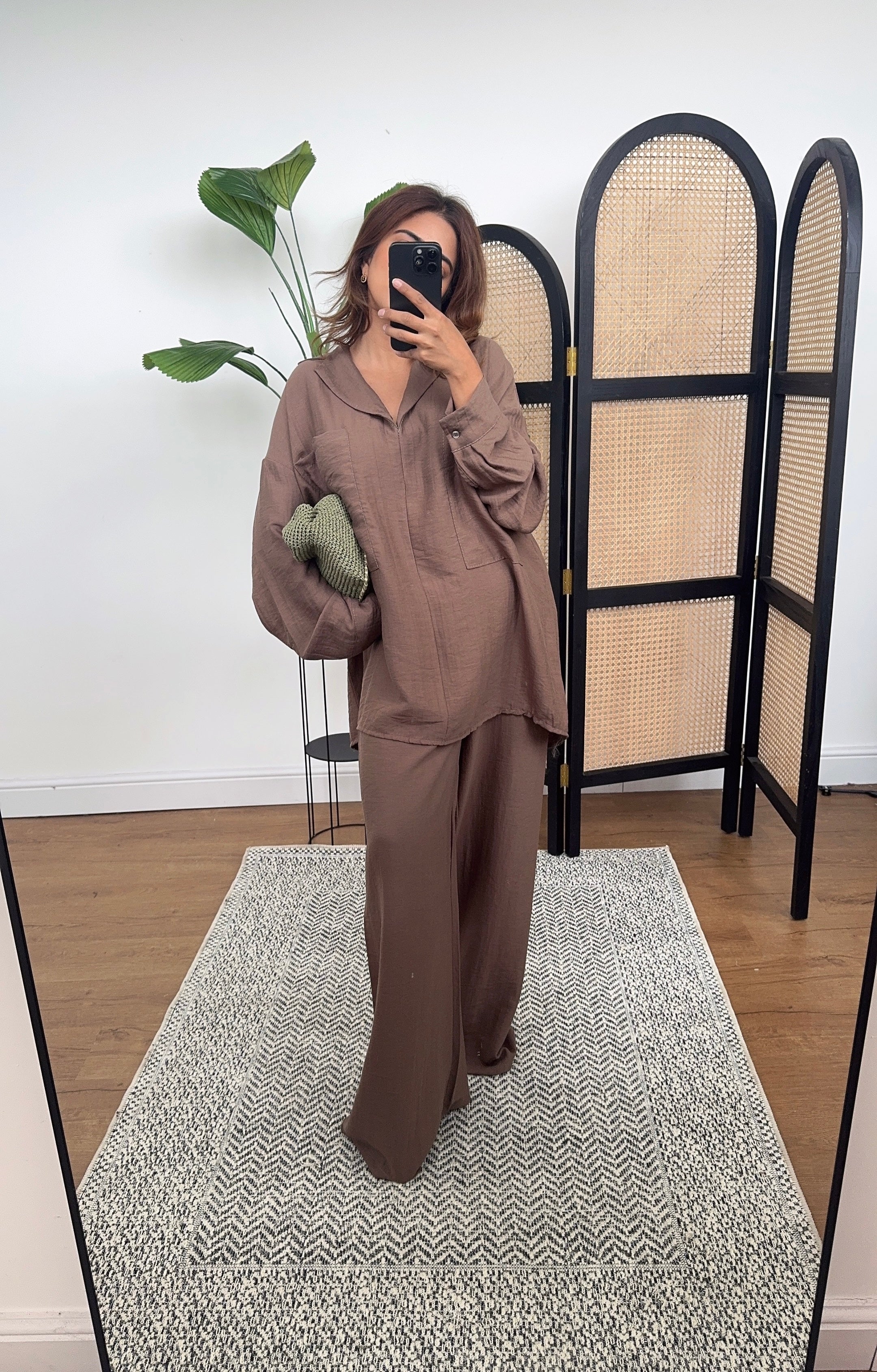 A chic and modest summer coord set featuring a collared-neck top with practical pockets and a flattering, modest length. Paired with airy, straight-leg trousers with an elasticated waist for all-day comfort. Lightweight, breathable, and effortlessly stylish — perfect for warm weather days.