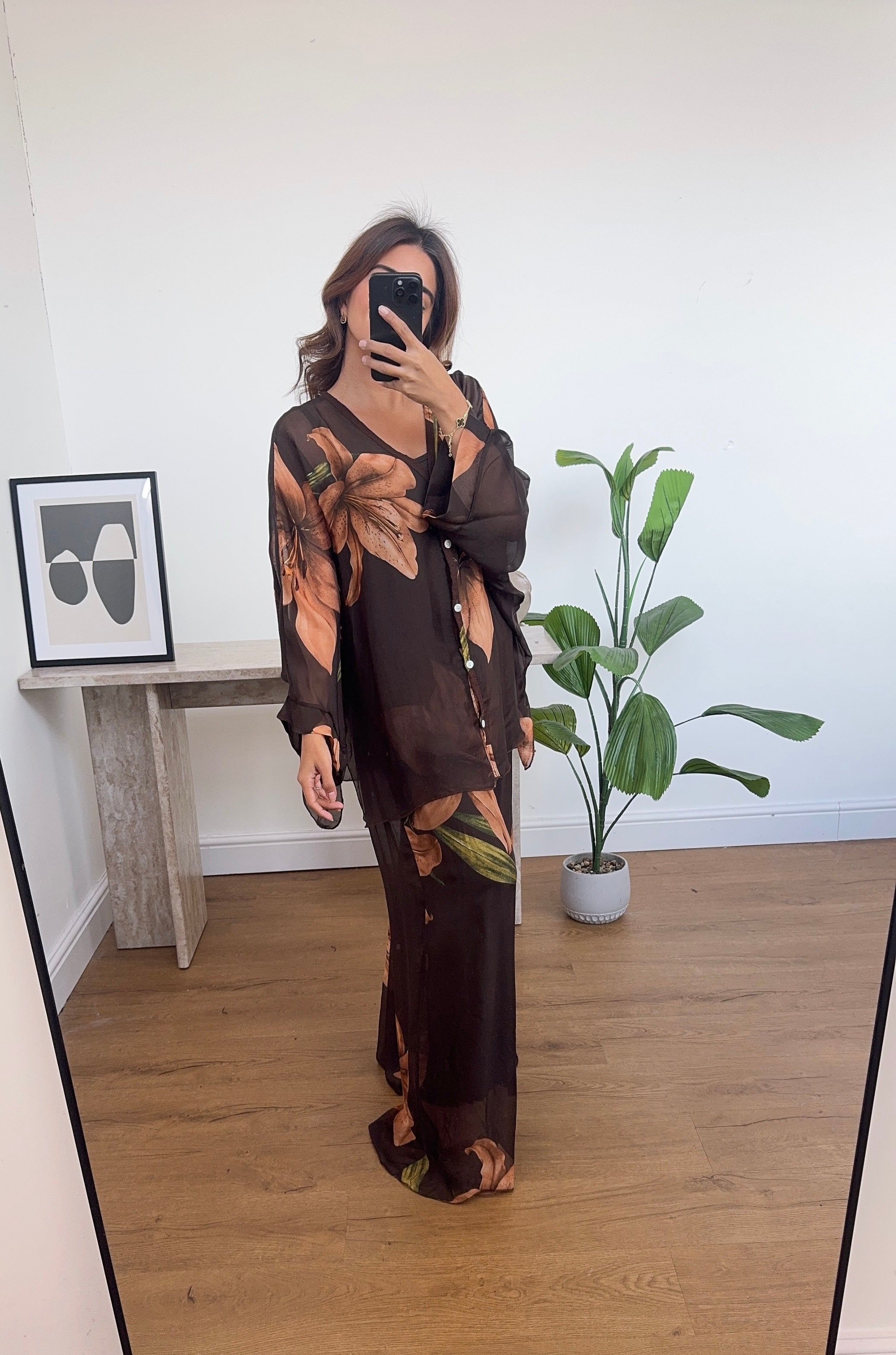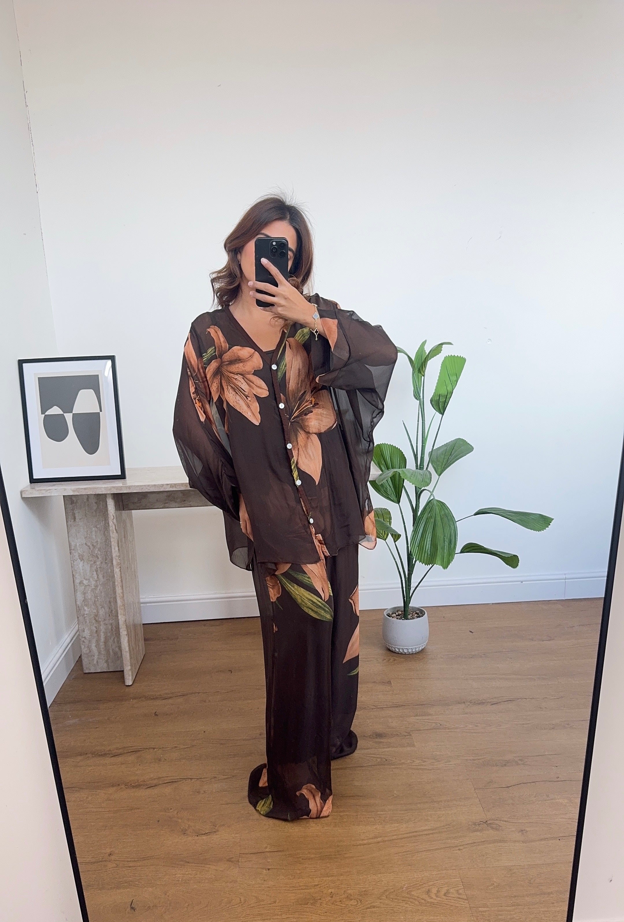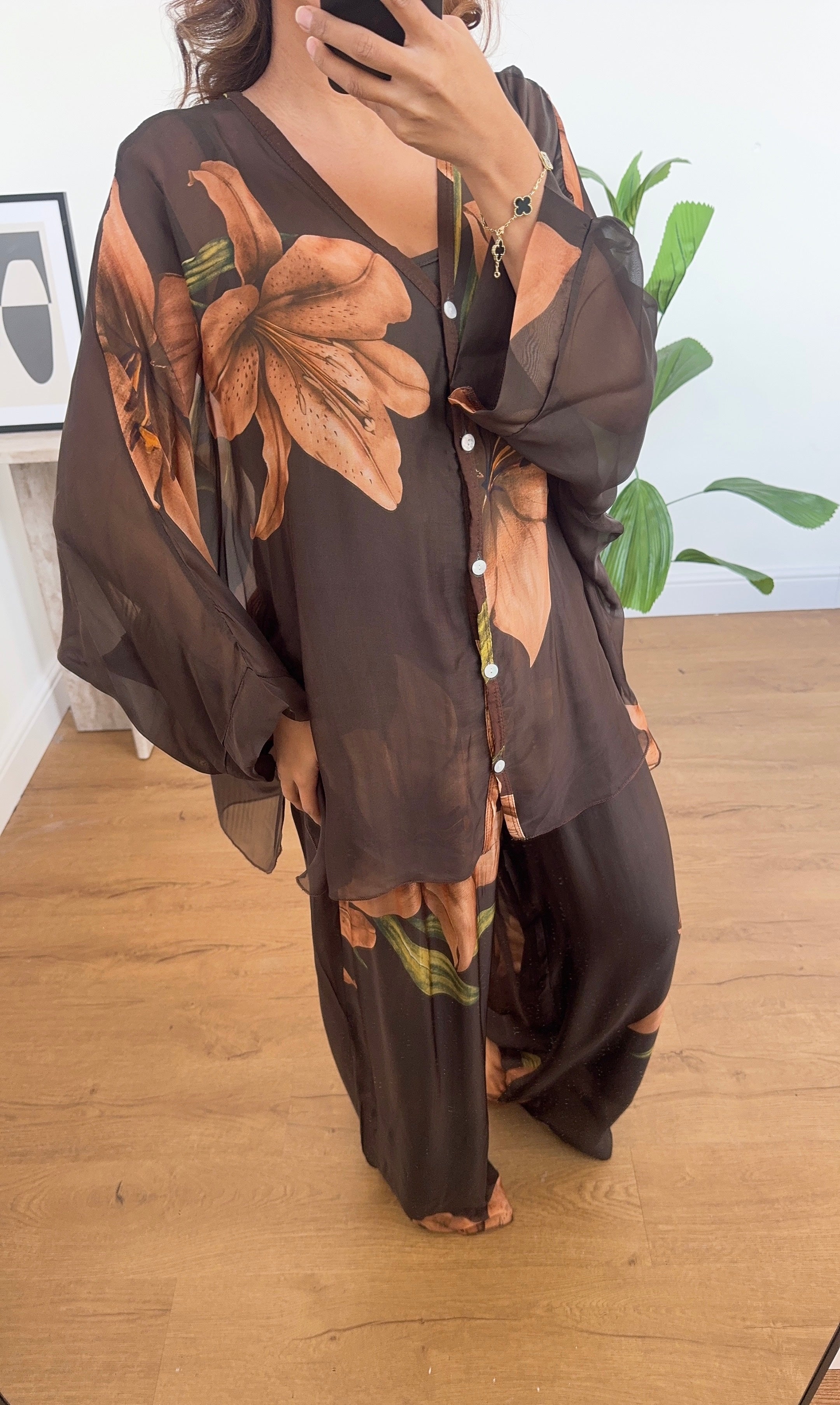 Jetting of for some winter sun? This coord is everything! Button down top with flare sleeves and a matching inner vest. Double layer trousers that has an elasticated waist.