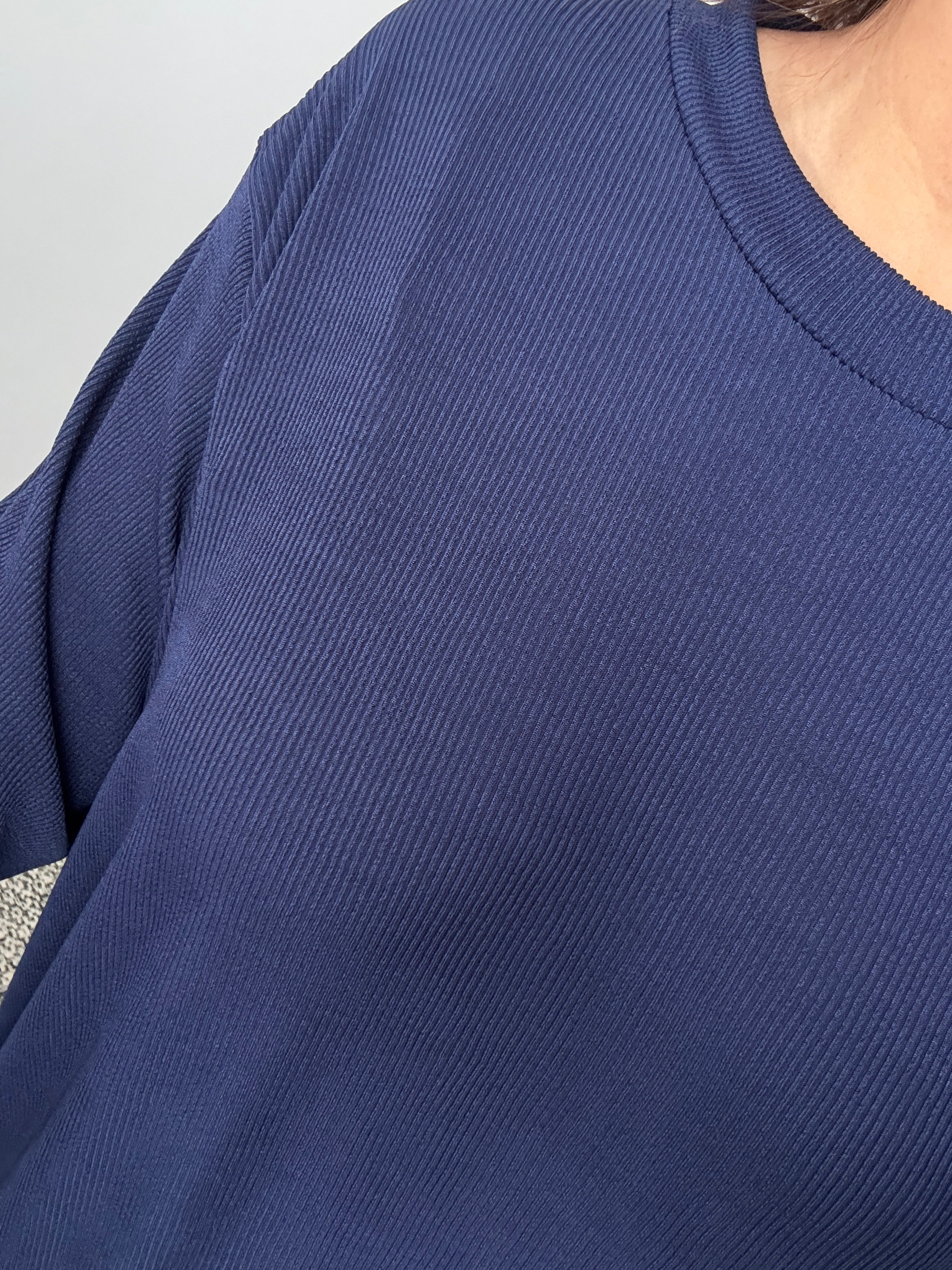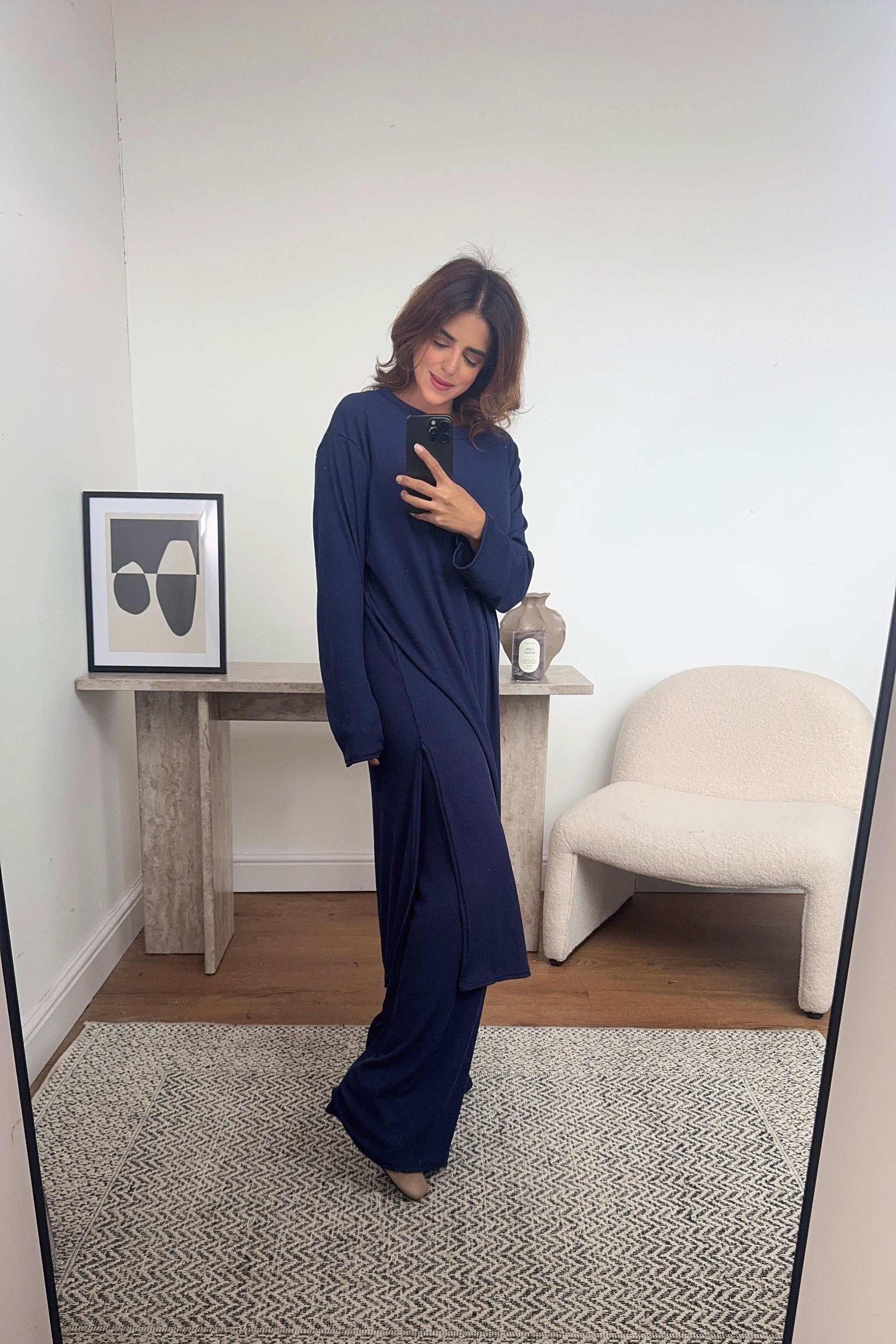 A basic ribbed coord featuring a long dress with side slit detail and trousers with an elasticated waist.