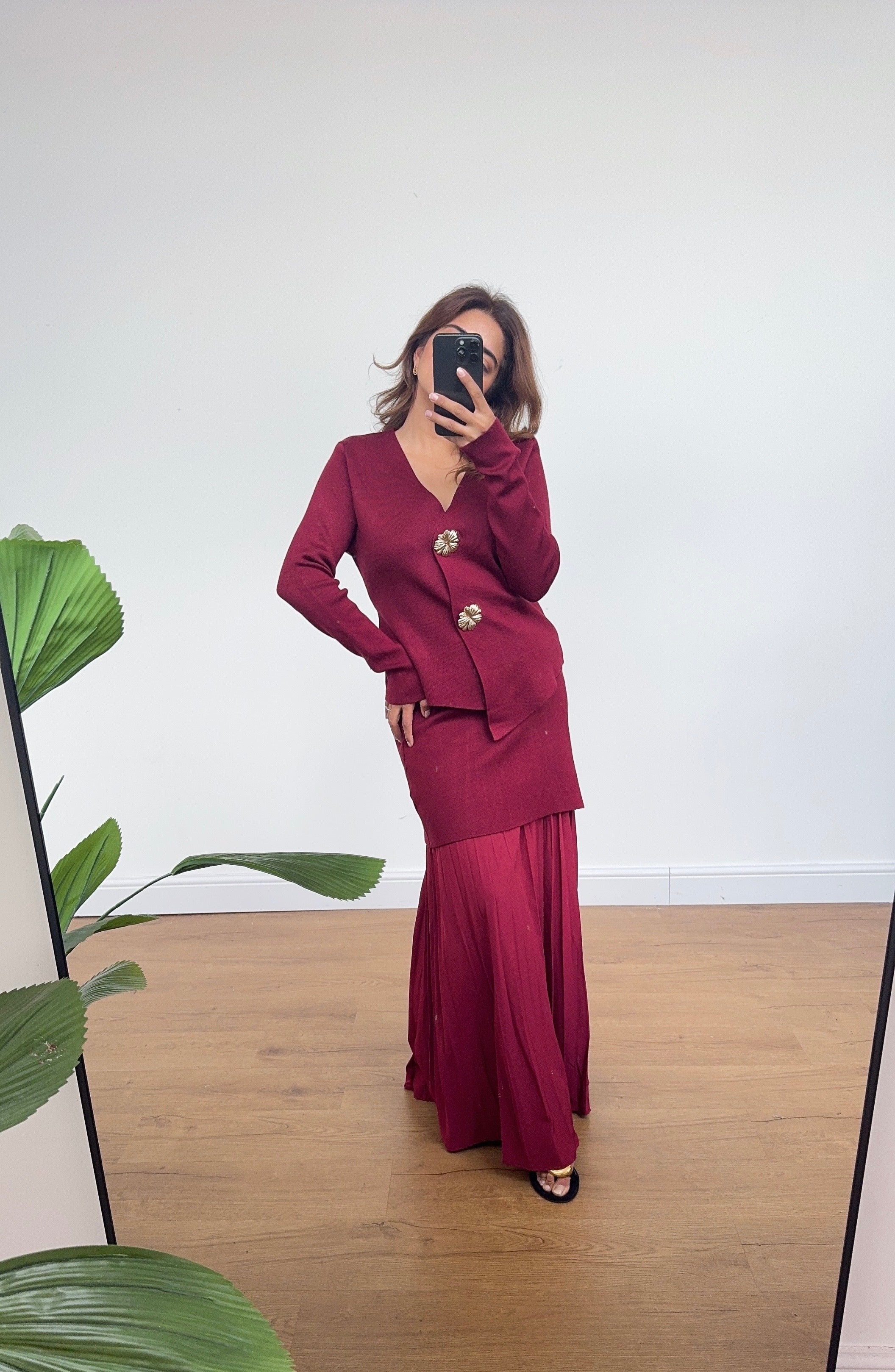 A unique co-ord set featuring a full-sleeve cardigan with gold buttons and an elegant up-down front design, paired with a skirt that’s fitted to the thigh and flows into graceful pleats at the bottom.