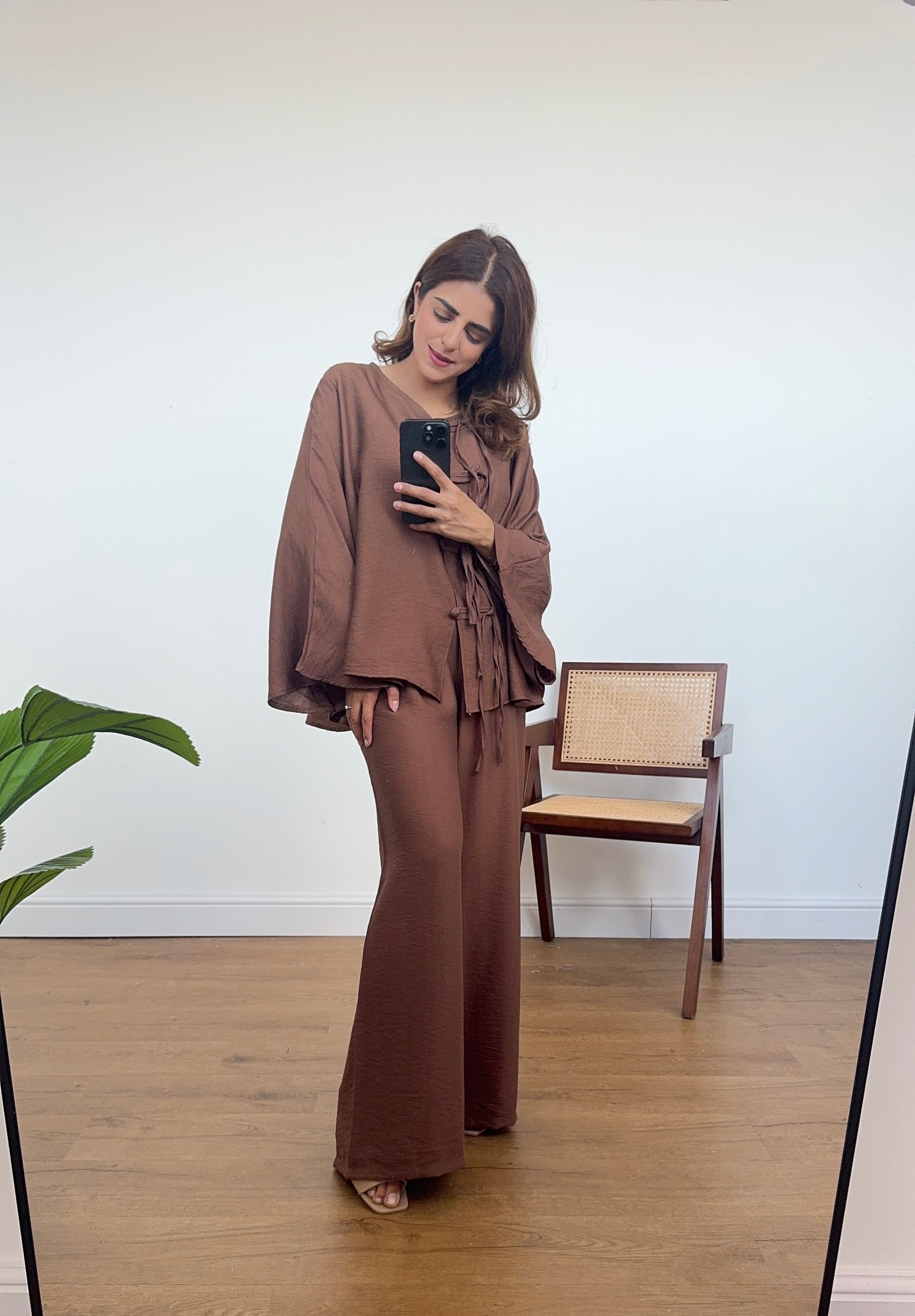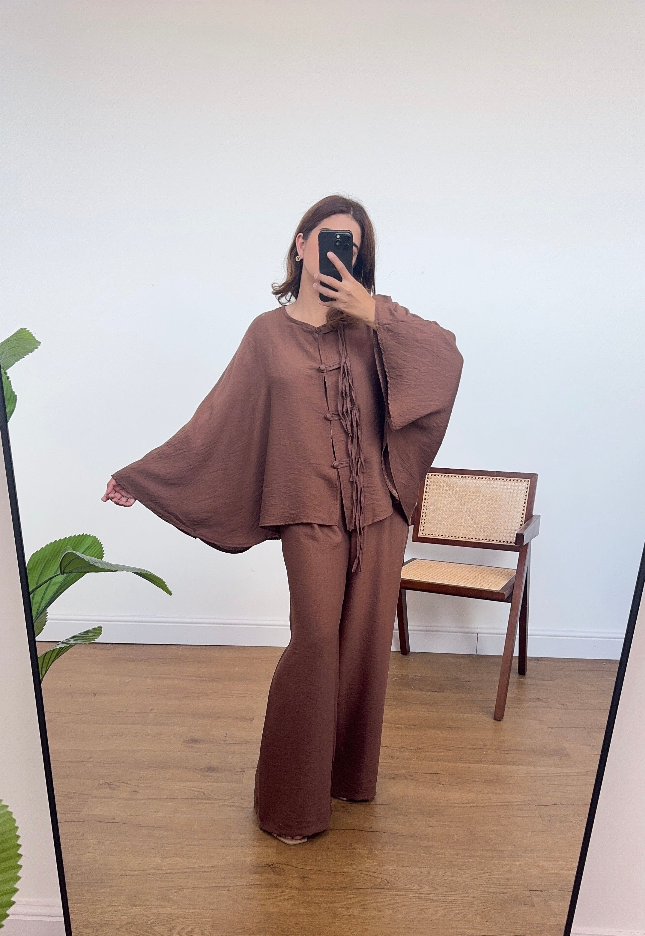 A graceful cape top adorned with three charming bow ties and delicate buttons, paired with matching trousers featuring a comfortable, elasticated waist for a blend of elegance and ease.