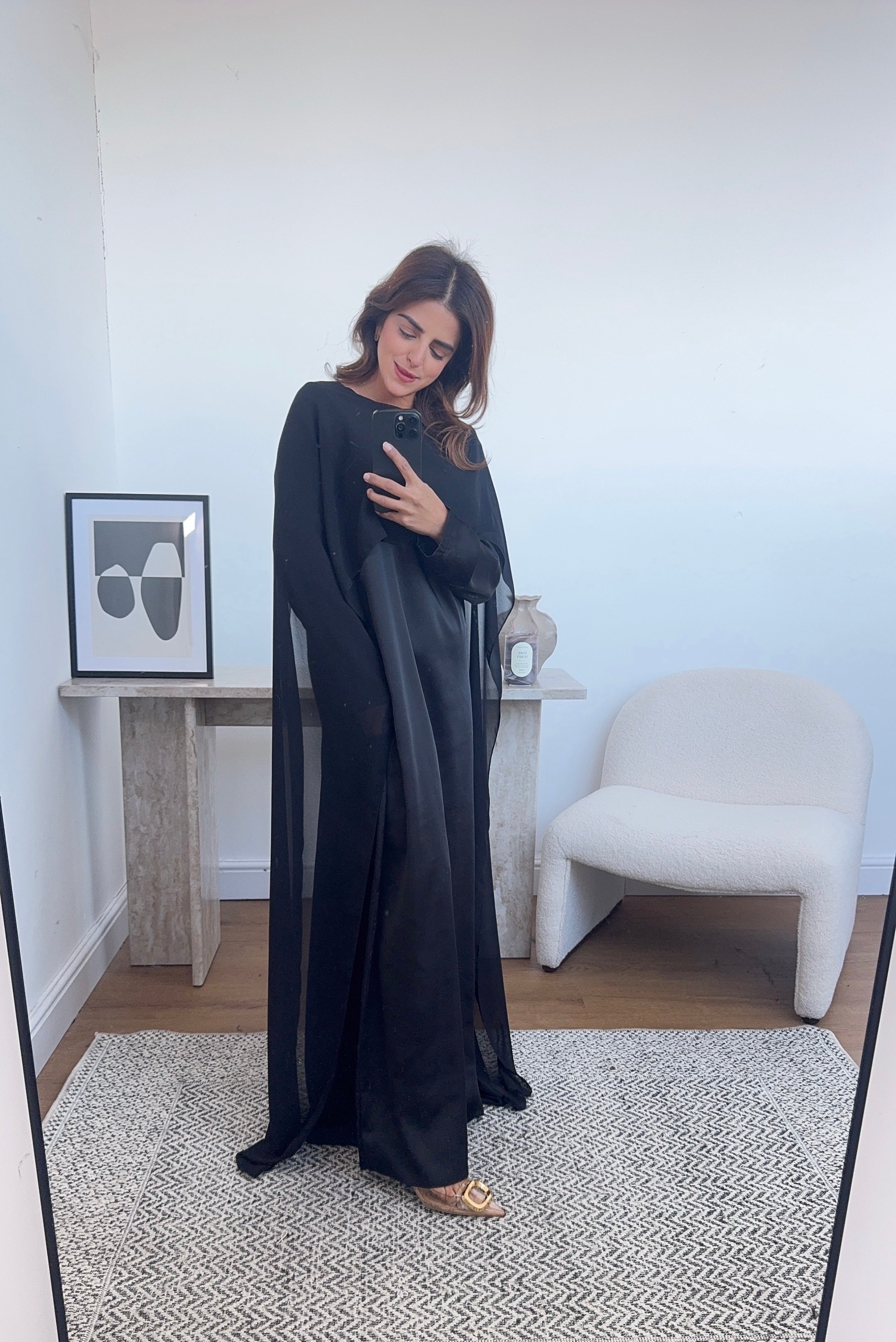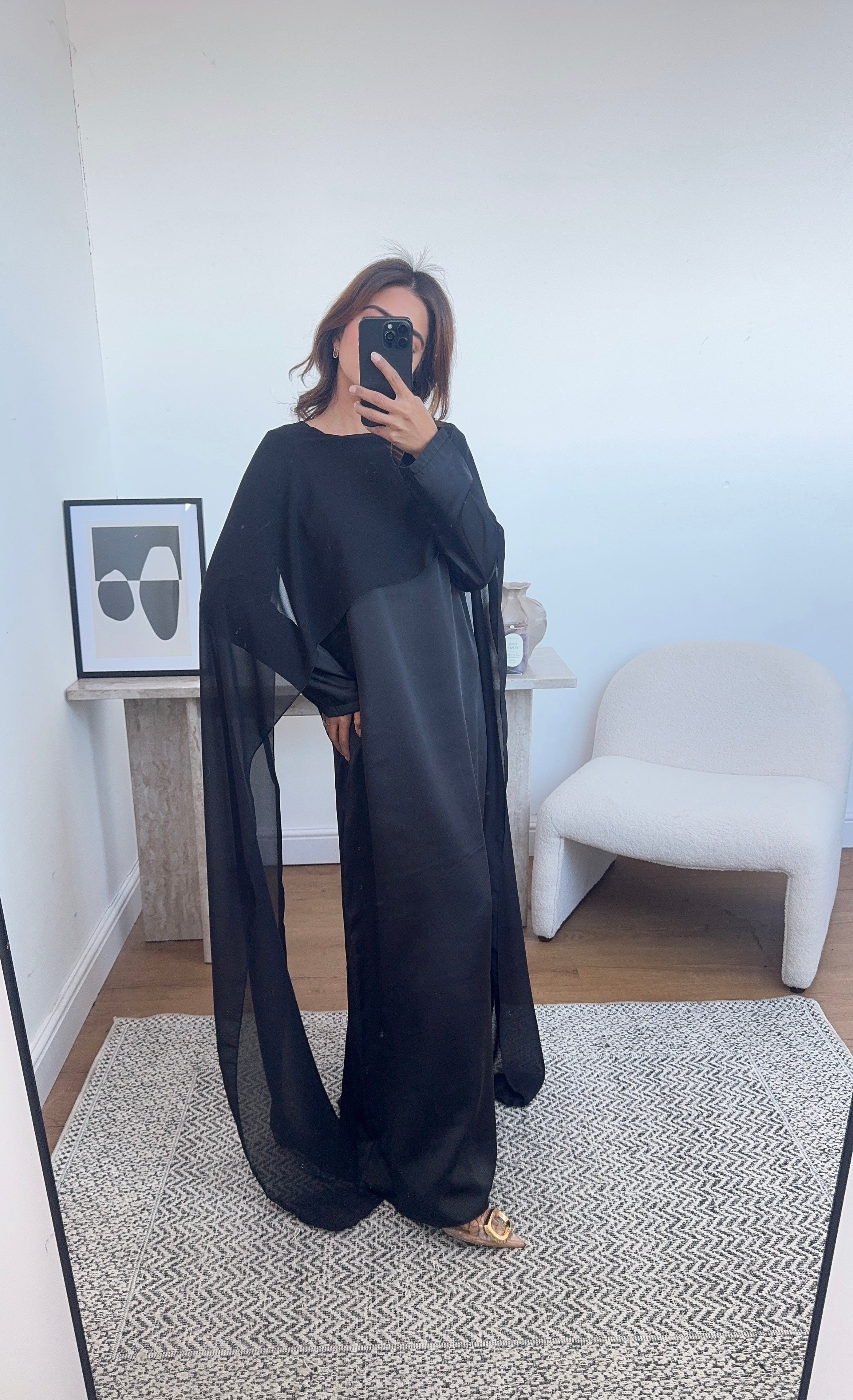 Beautiful long dress with a cape attached. Perfect for your upcoming events.