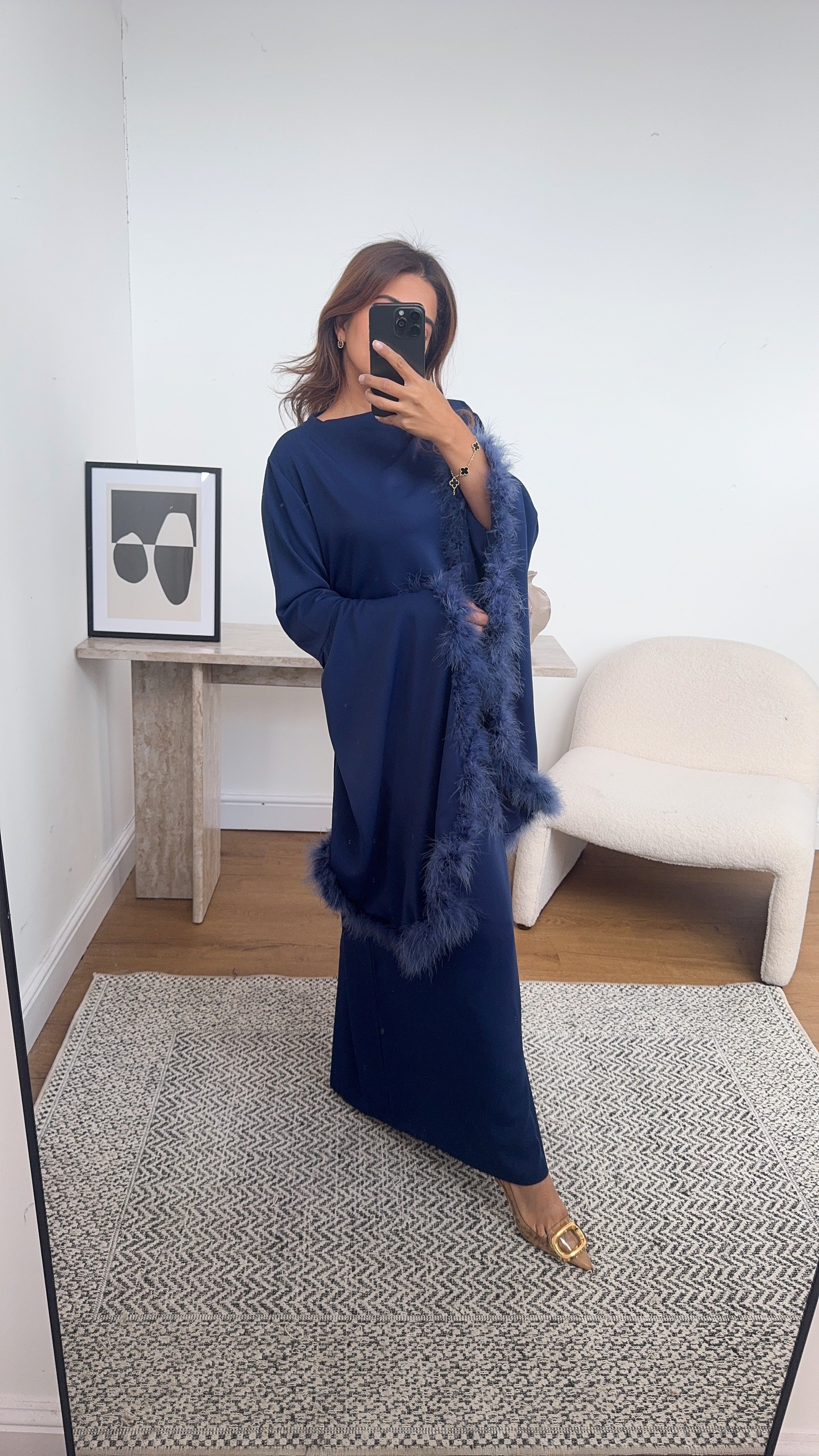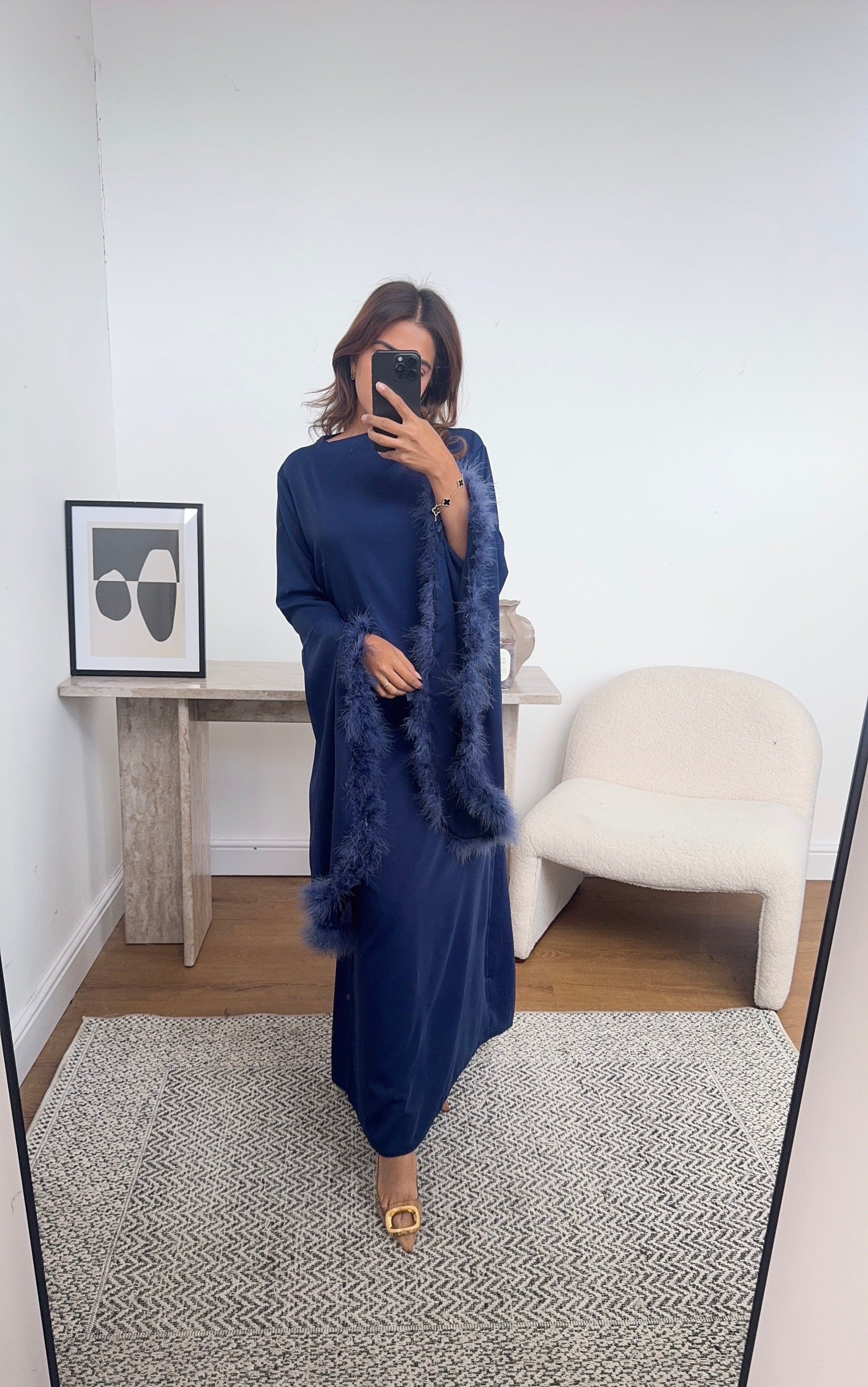 Beautiful high neck dress with flare faux feather trim sleeves and a back tie for fitting.