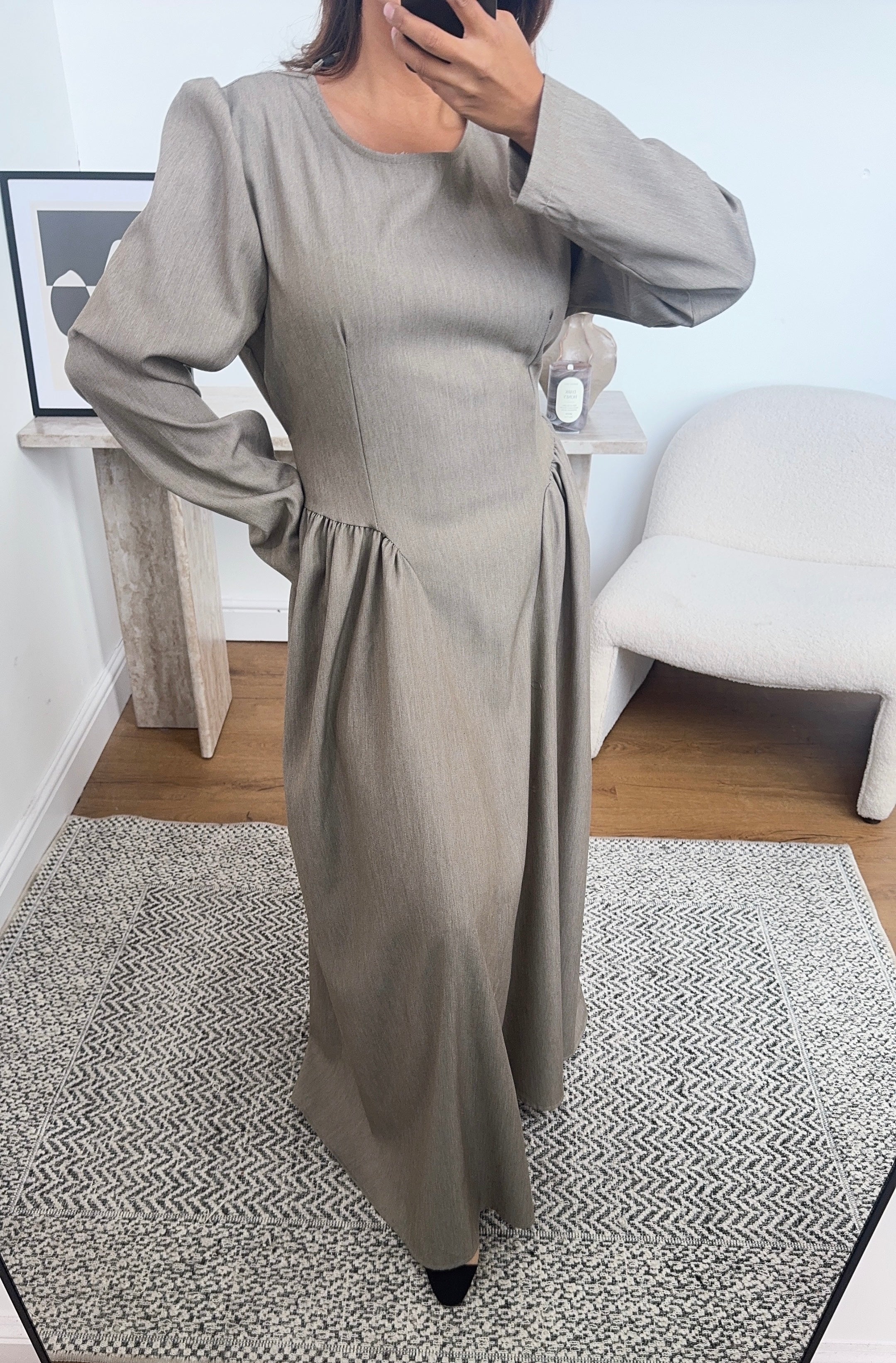 Taupe gathered waist dress- Marnia