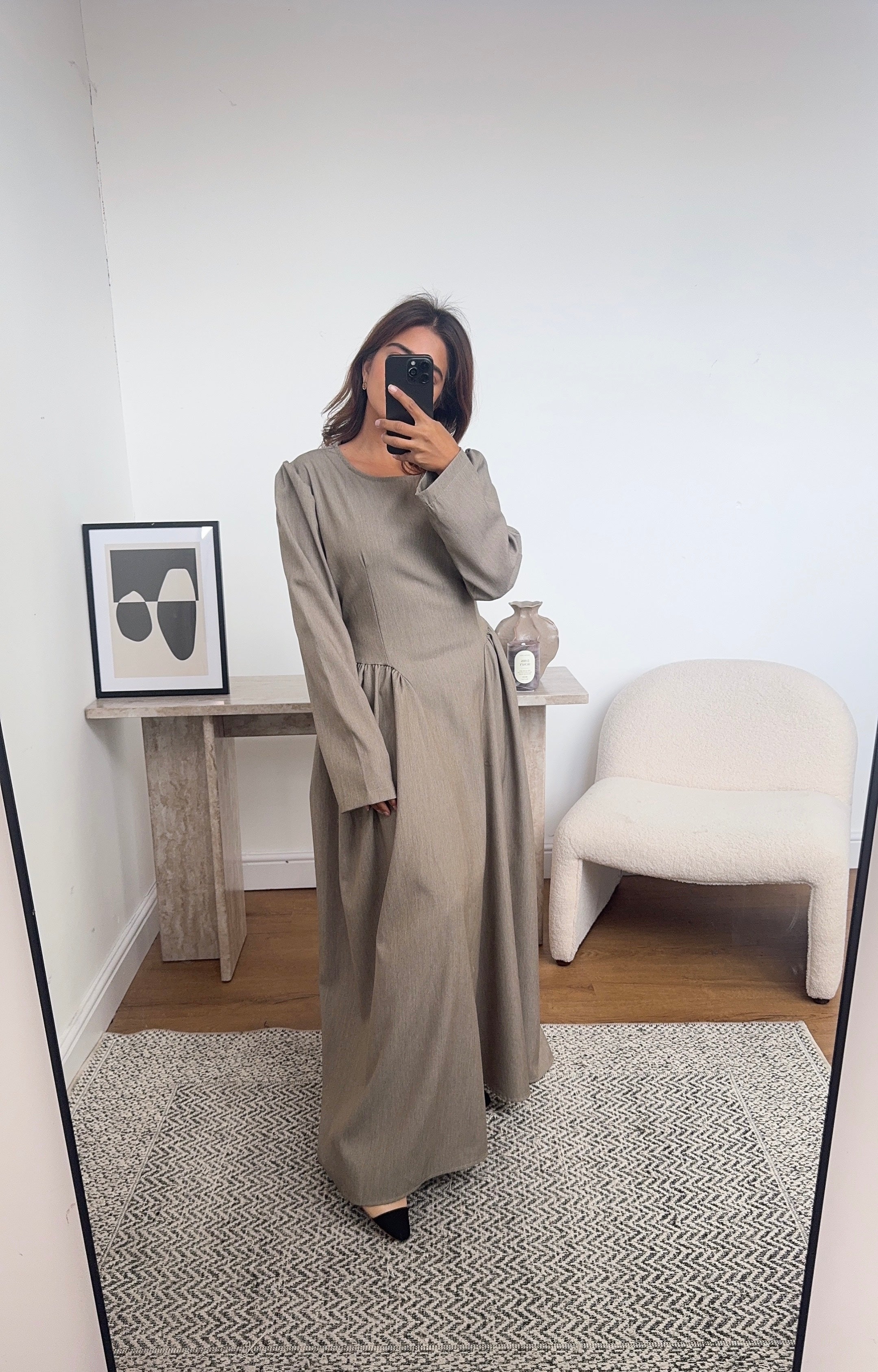 Chic taupe maxi dress with full sleeves and a softly structured silhouette. The dress has a fitted bodice and gentle pleating at the waist that creates a flowy, elegant drape. Has a belt at the back for fitting.