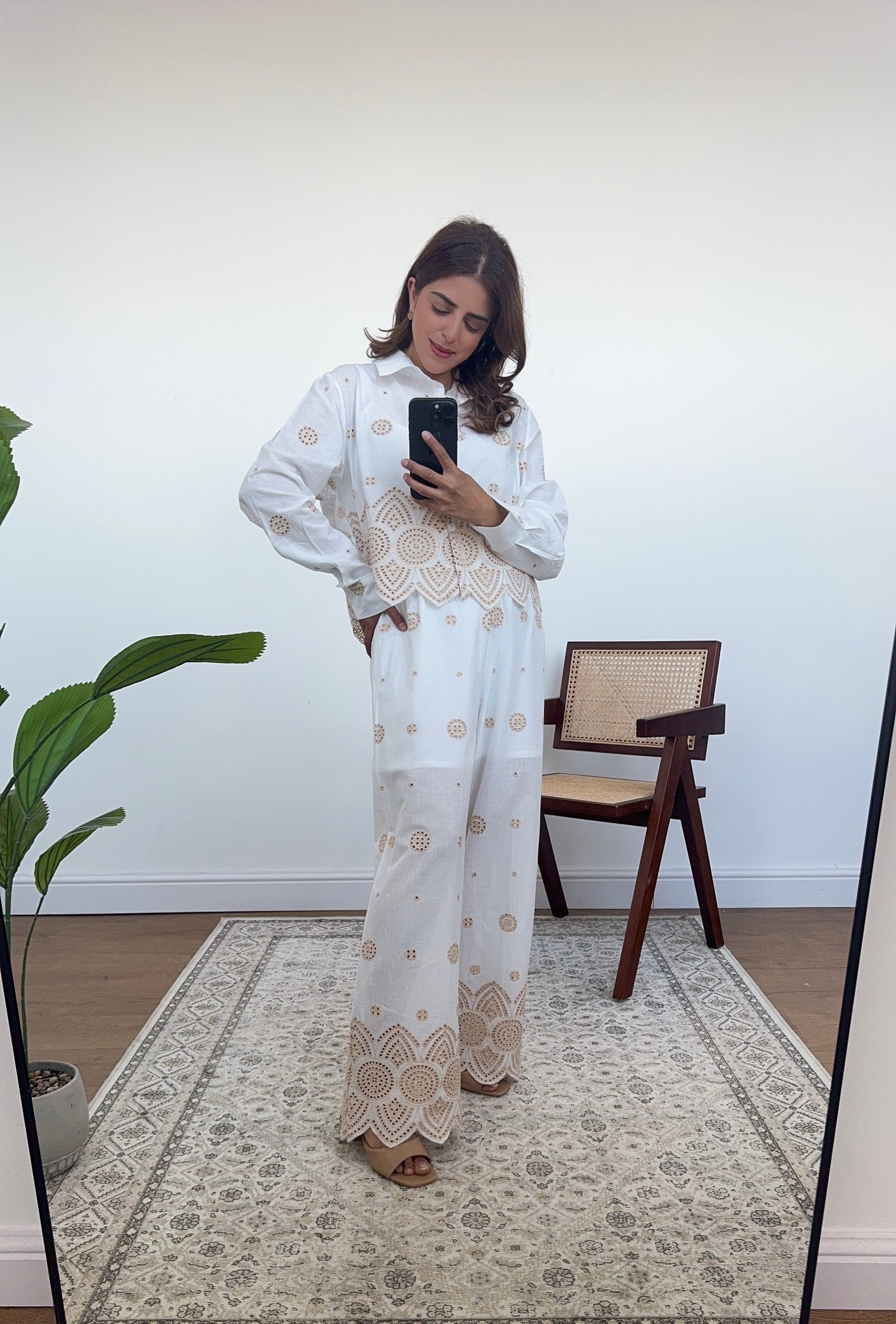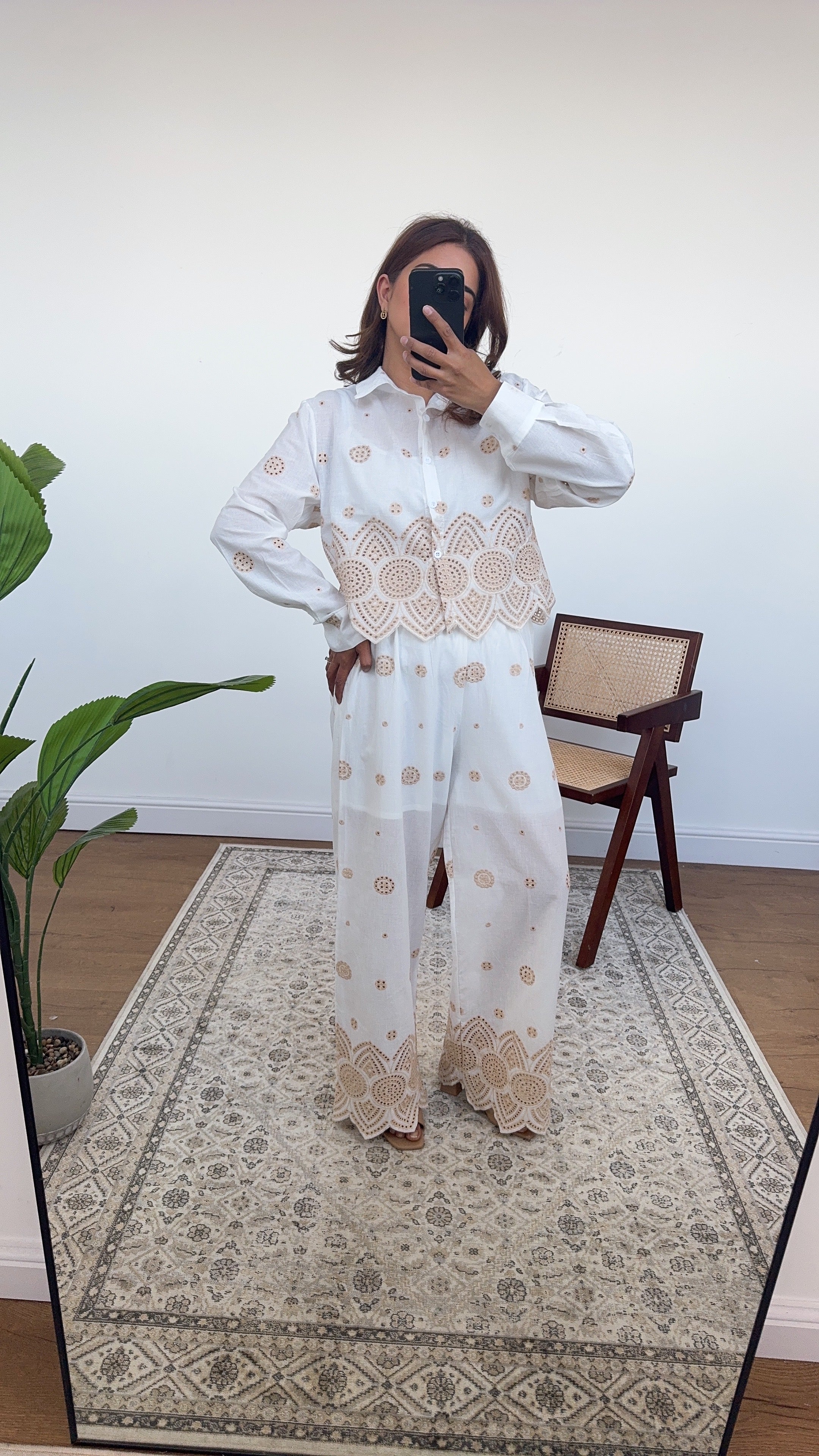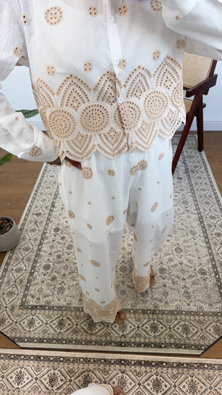 A stunning crochet co-ord set featuring a breezy, slightly see-through button-up shirt and matching wide-leg trousers. Lightweight and elegant, perfect for summer—best layered with a white inner set for modesty and contrast.