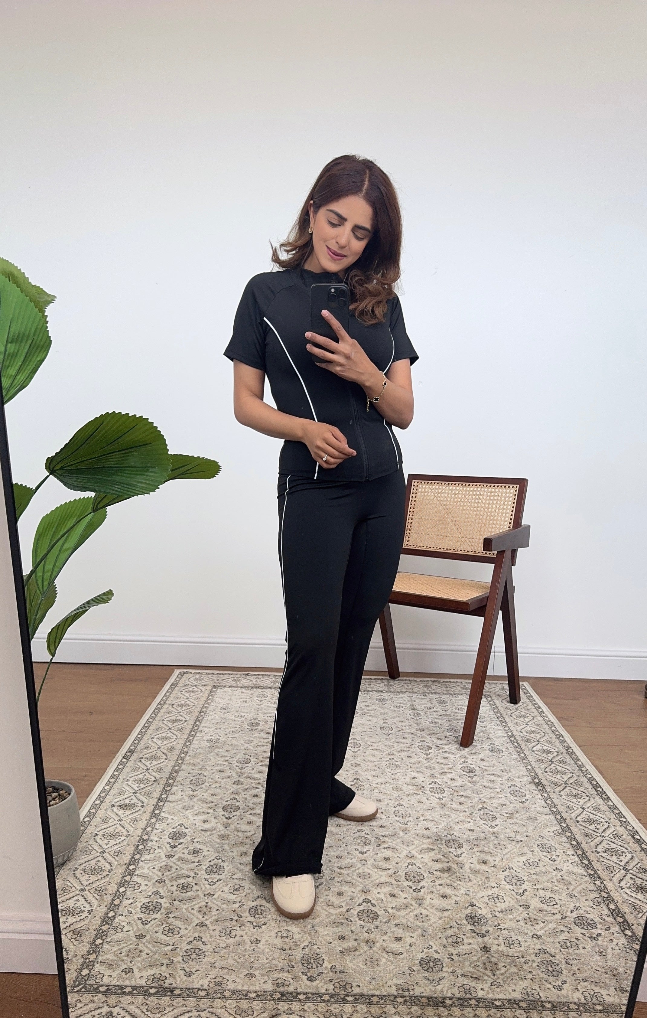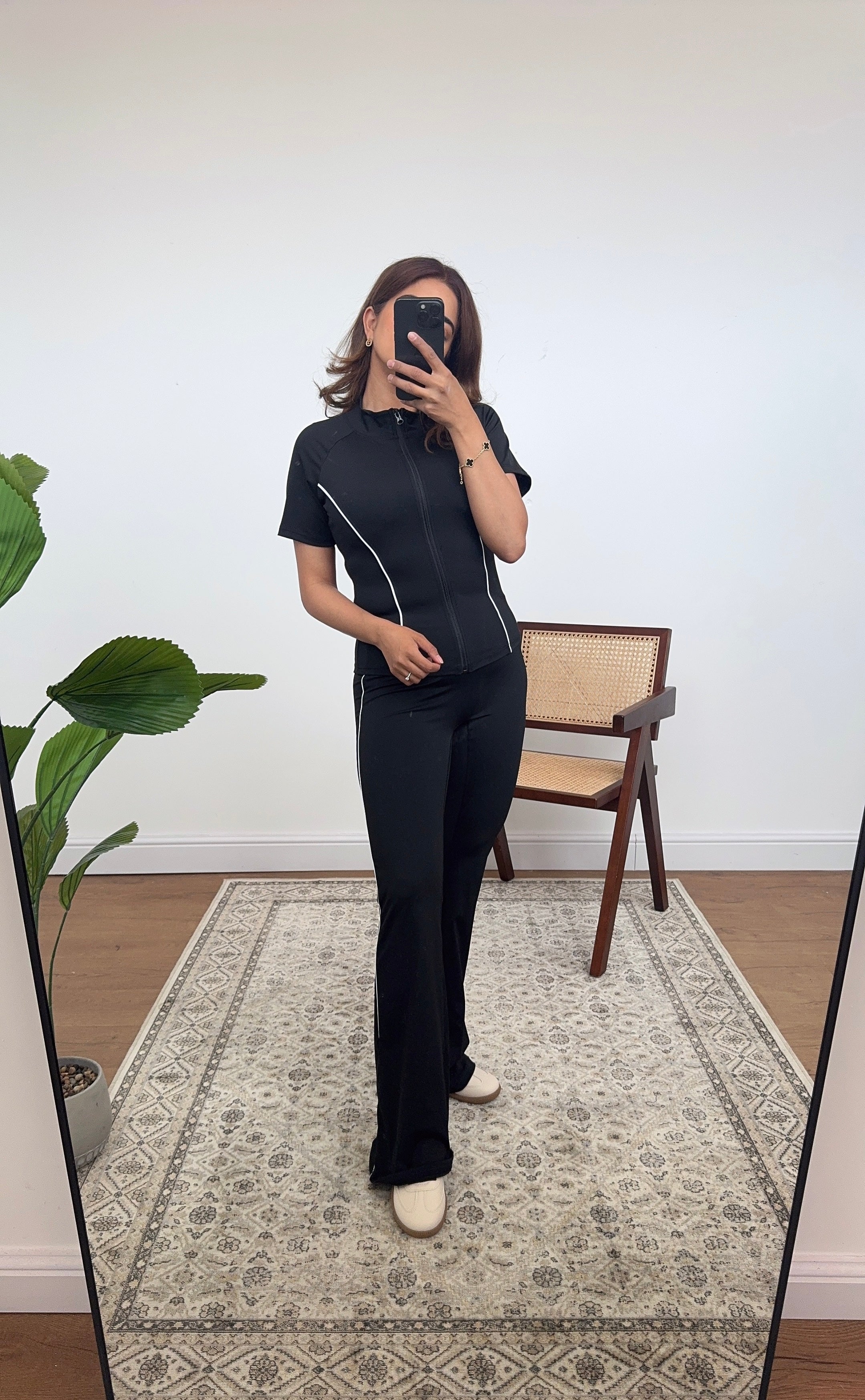 The perfect gym fit featuring a zip sculpt through jacket with high waisted sculpt flare trousers