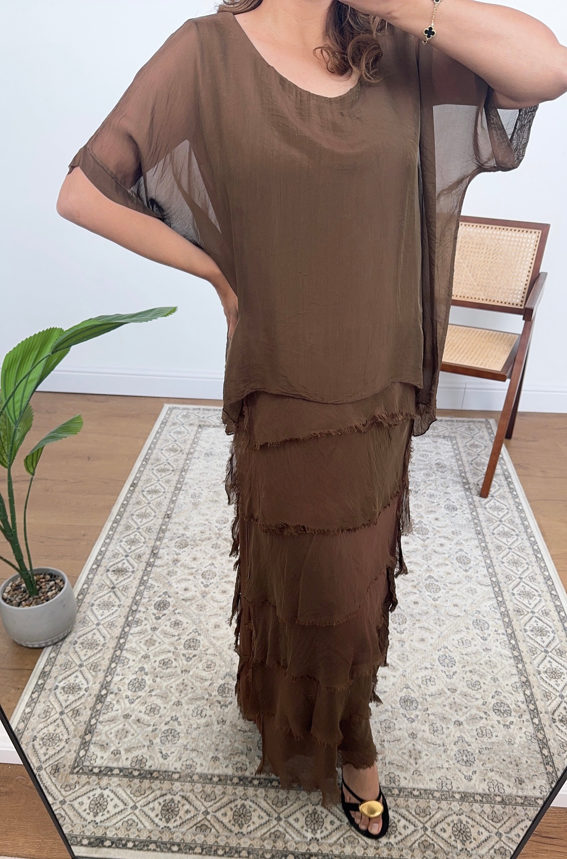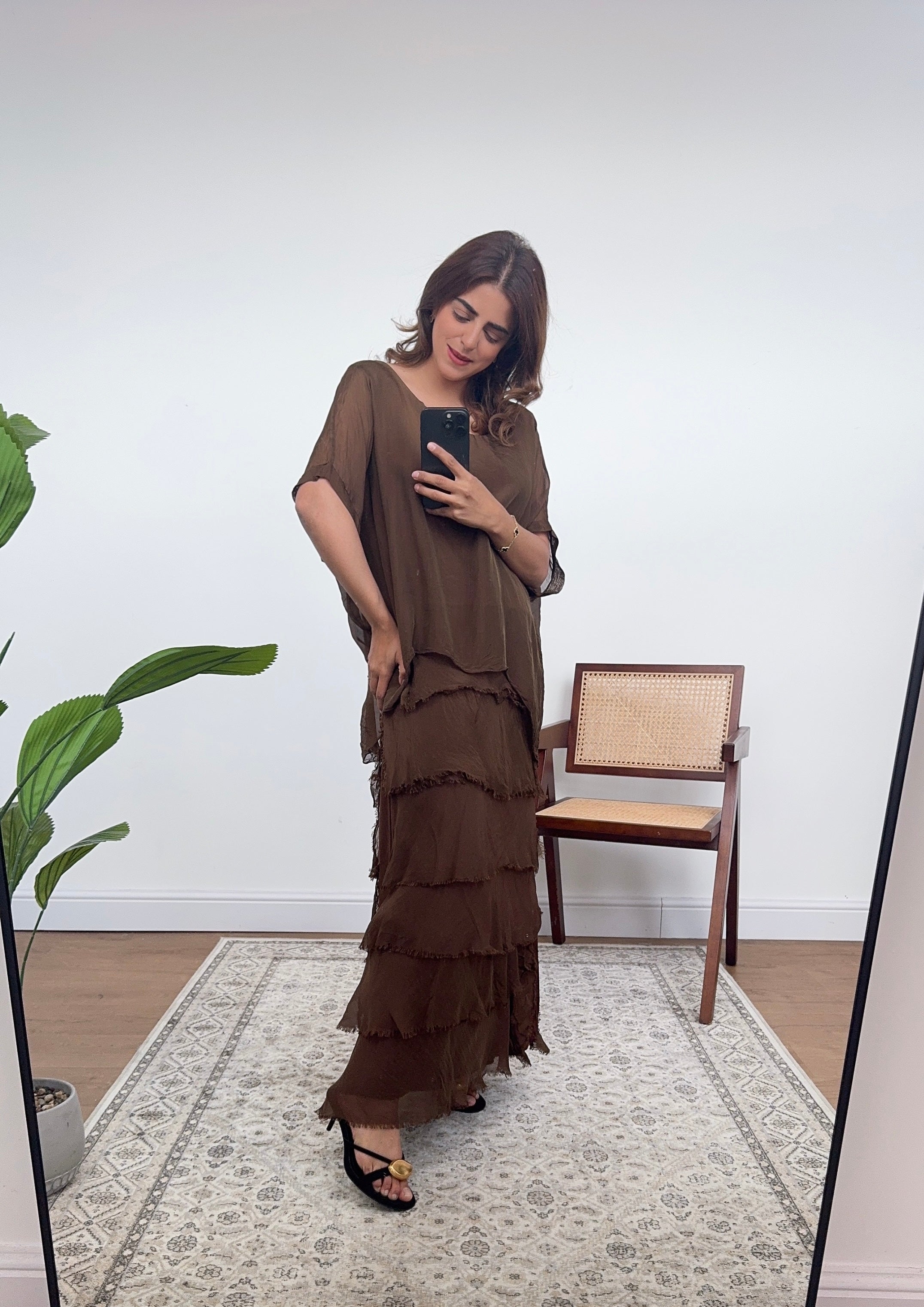 An elegant ruffle dress with an added lining, perfect for your upcoming holidays.