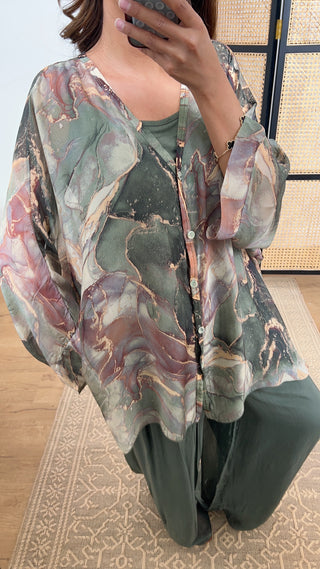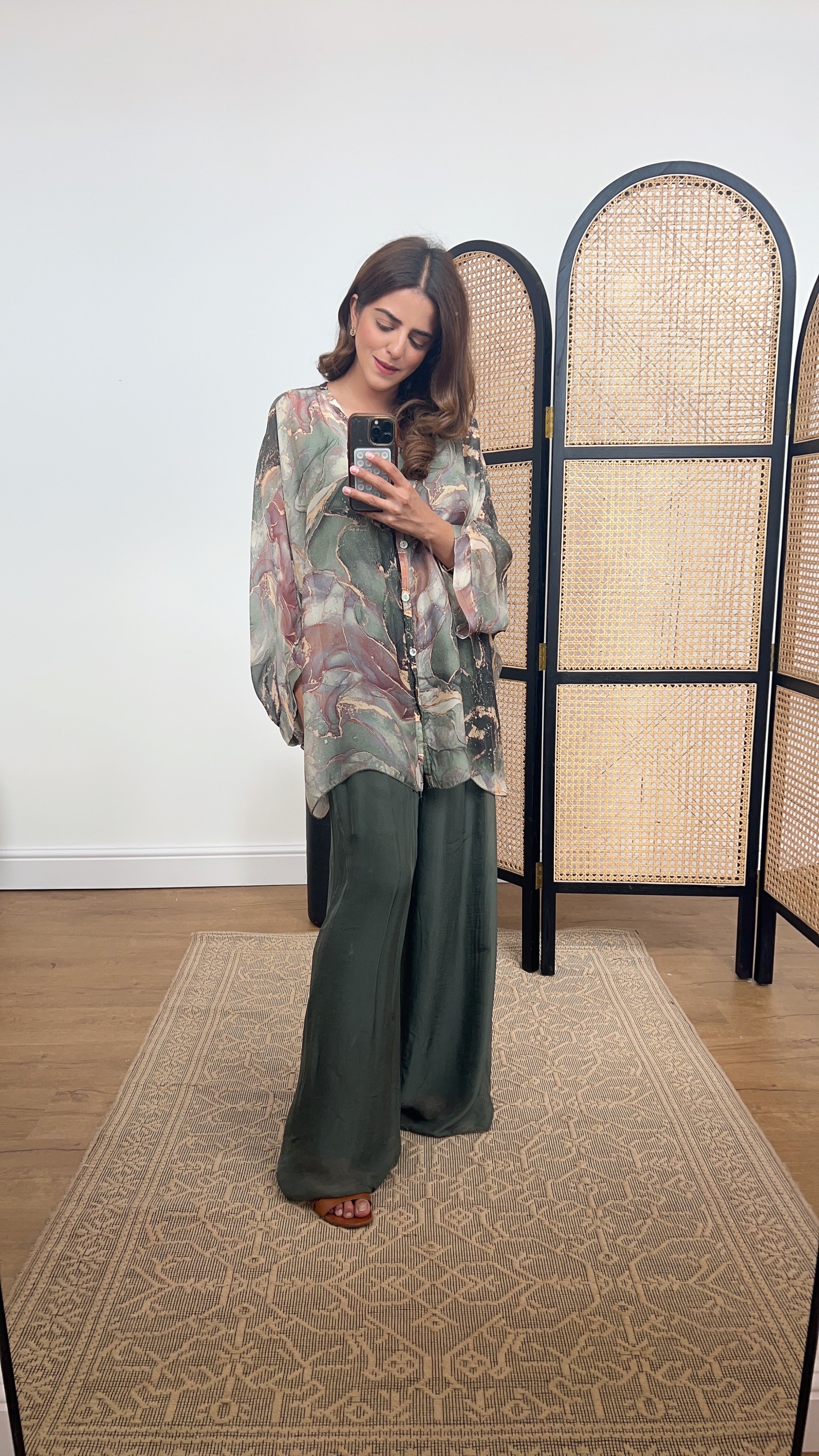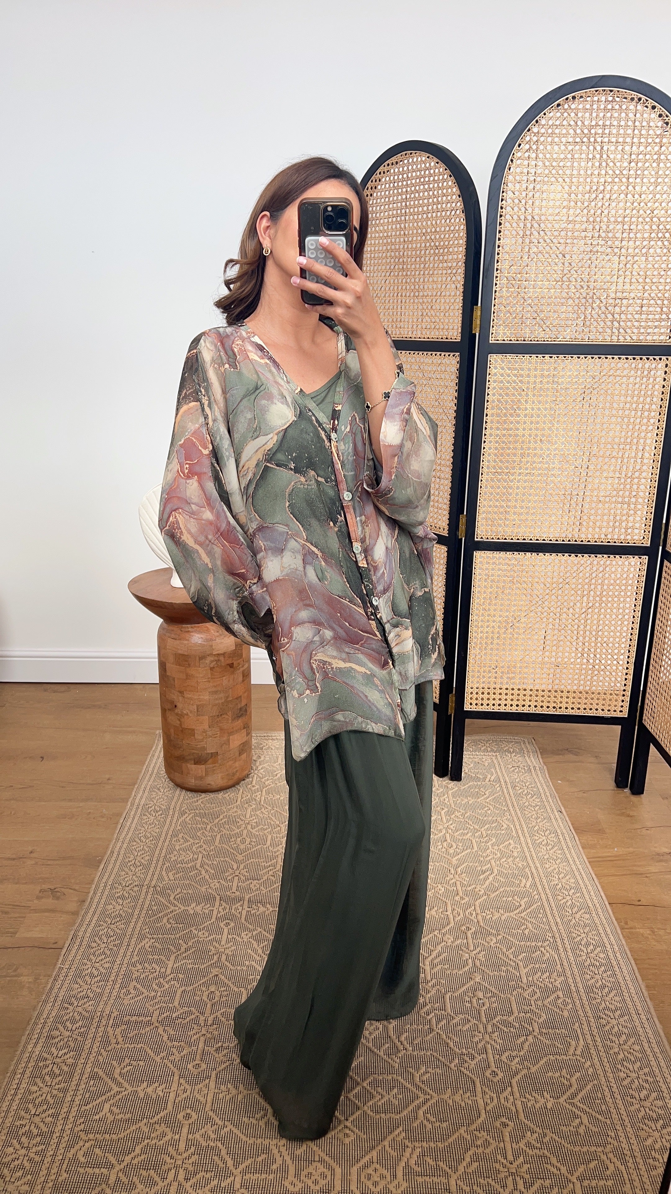 Jetting of for some winter sun? This coord is everything! Button down top with flare sleeves and a matching inner vest. Double layer trousers that has an elasticated waist.