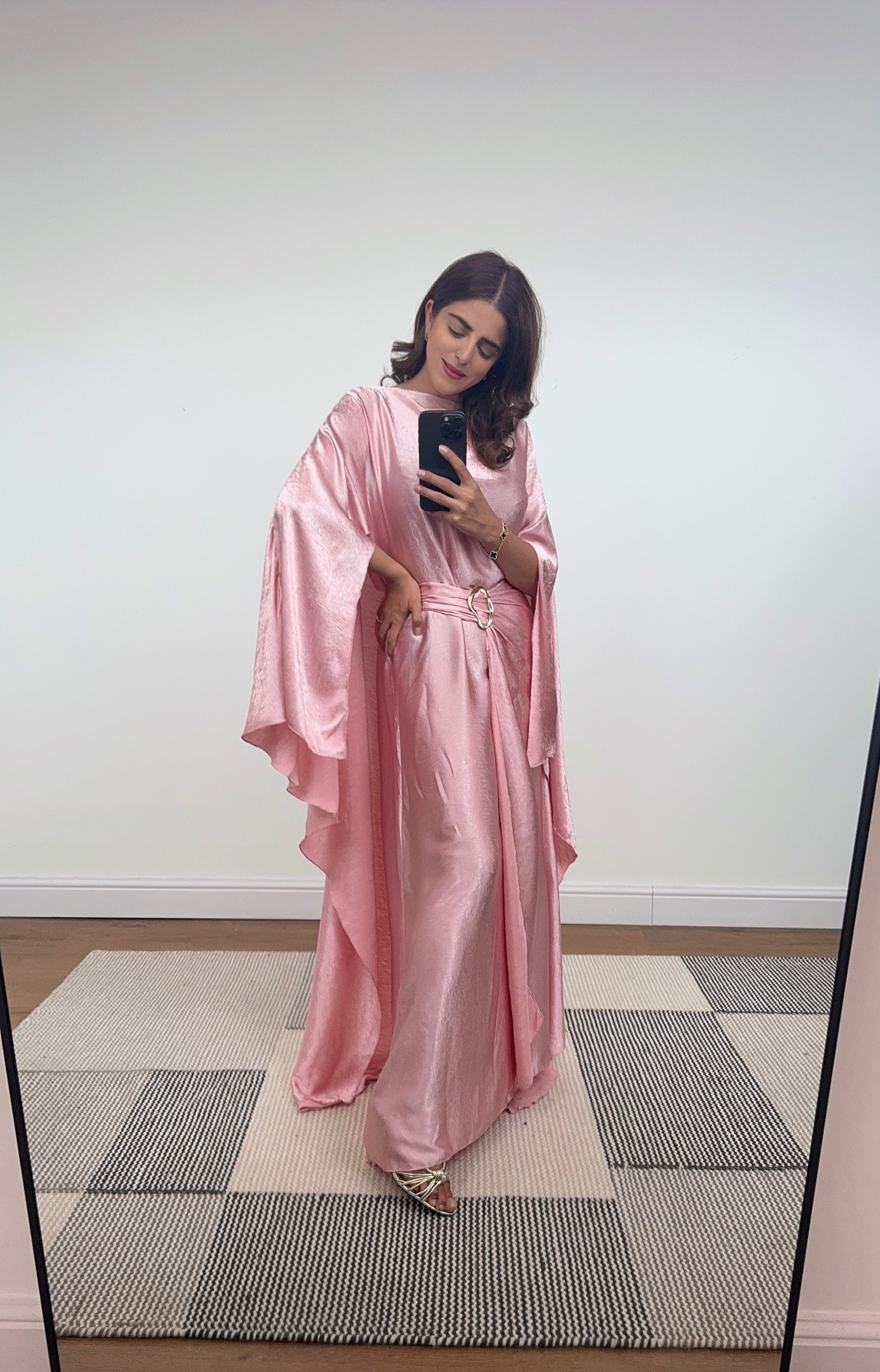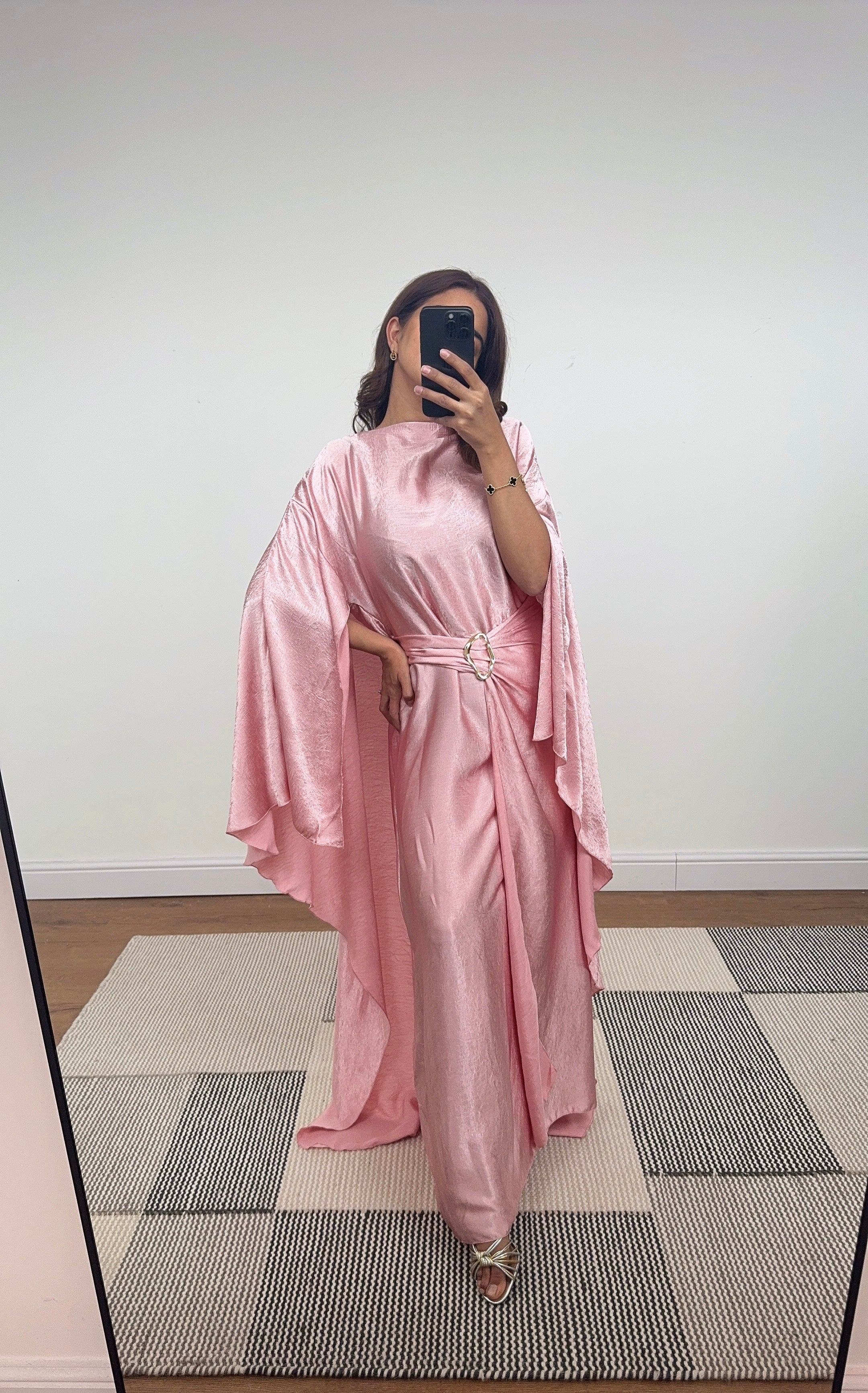 Beautiful long crinkle dress with buckle tie detail at the front with tie belt and majestic cape flowing down the back.